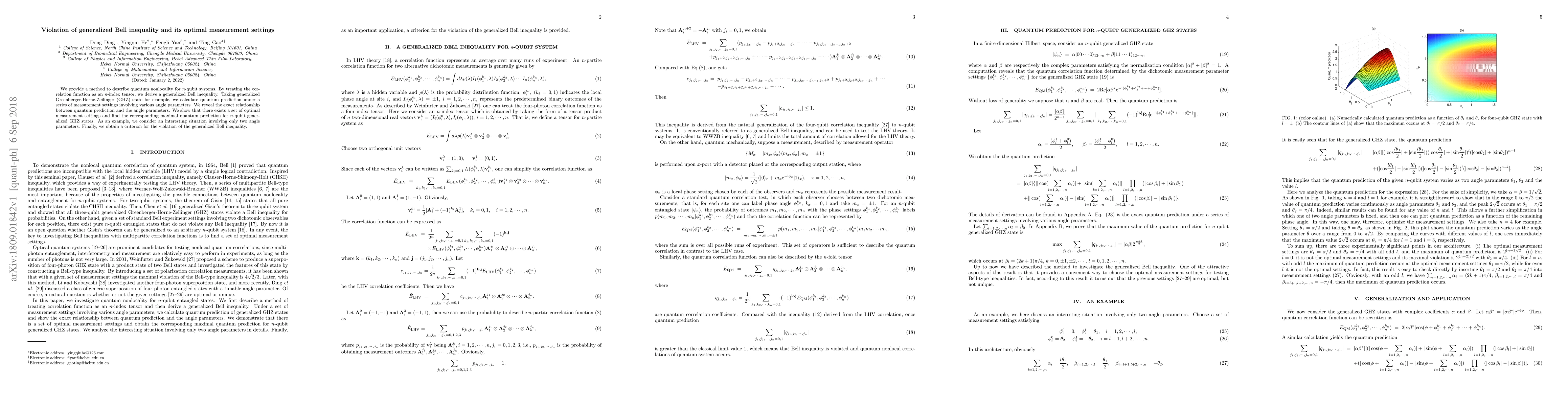 We provide a method to describe quantum nonlocality for $n$-qubit systems. By treating the correlation function as an $n$-index tensor, we derive a generalized Bell inequality. Taking generalized Greenberger-Horne-Zeilinger (GHZ) state for example, we calculate quantum prediction under a series of measurement settings involving various angle parameters. We reveal the exact relationship between quantum prediction and the angle parameters. We show that there exists a set of optimal measurement settings and find the corresponding maximal quantum prediction for $n$-qubit generalized GHZ states. As an example, we consider an interesting situation involving only two angle parameters. Finally, we obtain a criterion for the violation of the generalized Bell inequality.