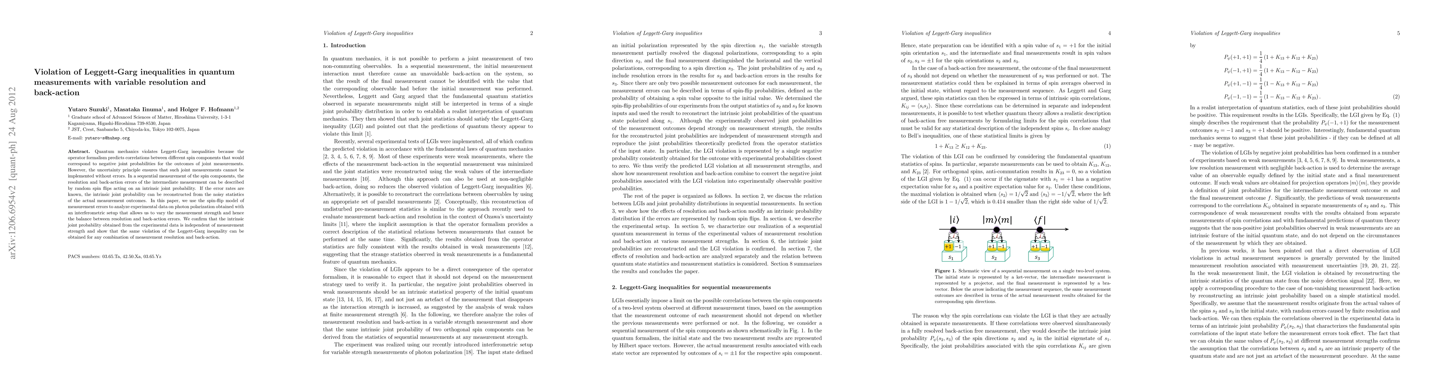 Quantum mechanics violates Leggett-Garg inequalities because the operator formalism predicts correlations between different spin components that would correspond to negative joint probabilities for the outcomes of joint measurements. However, the uncertainty principle ensures that such joint measurements cannot be implemented without errors. In a sequential measurement of the spin components, the resolution and back-action errors of the intermediate measurement can be described by random spin flips acting on an intrinsic joint probability. If the error rates are known, the intrinsic joint probability can be reconstructed from the noisy statistics of the actual measurement outcomes. In this paper, we use the spin-flip model of measurement errors to analyze experimental data on photon polarization obtained with an interferometric setup that allows us to vary the measurement strength and hence the balance between resolution and back-action errors. We confirm that the intrinsic joint probability obtained from the experimental data is independent of measurement strength and show that the same violation of the Leggett-Garg inequality can be obtained for any combination of measurement resolution and back-action.