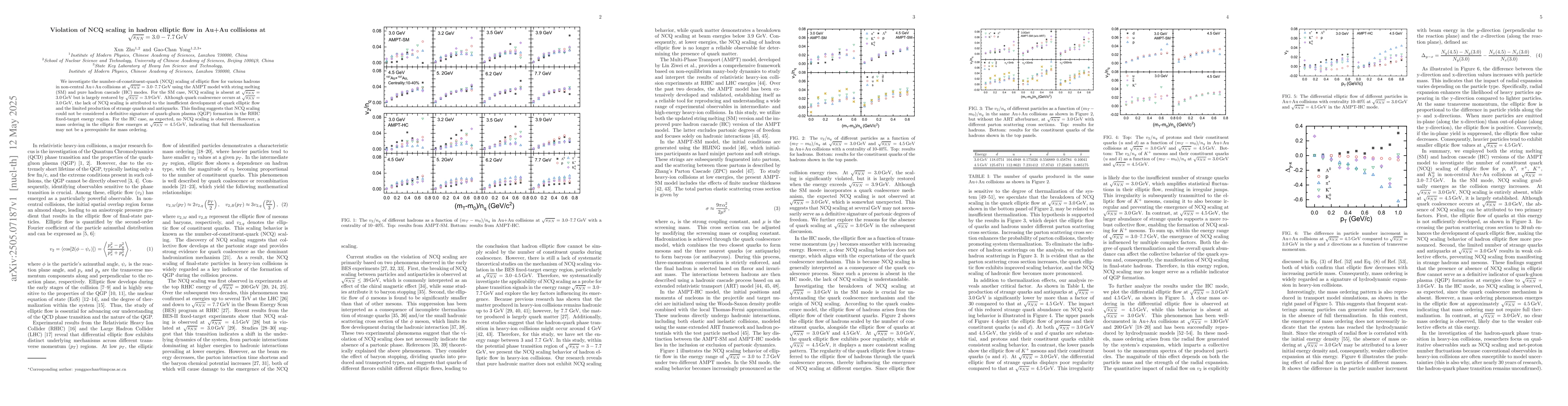 The paper presents a detailed analysis of NCQ scaling in hadron elliptic flow across a range of energies using the AMPT model, highlighting the energy dependence and the role of quark coalescence and hadronization processes.