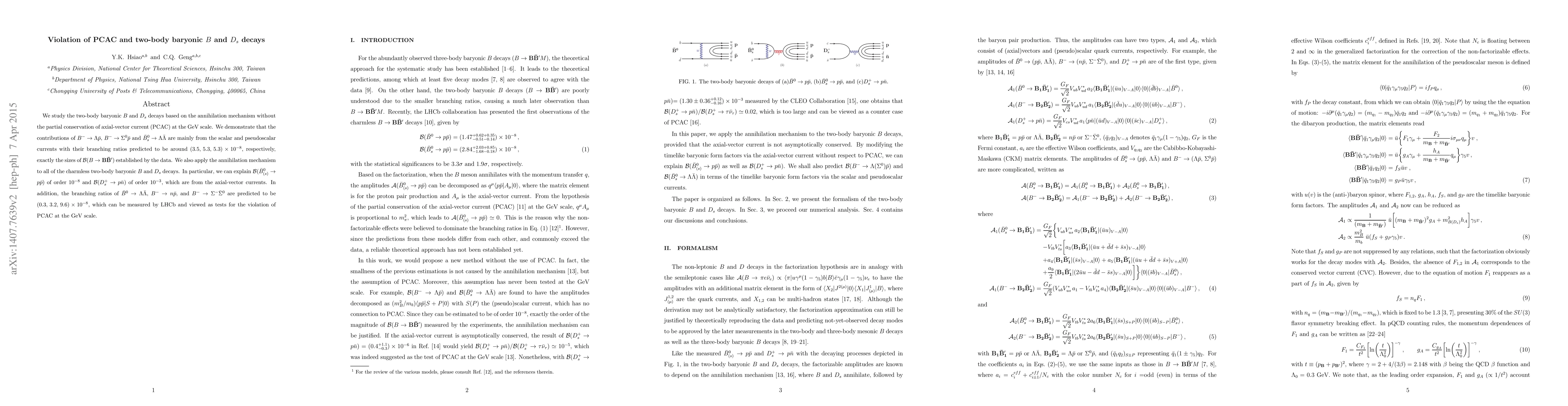 We study the two-body baryonic $B$ and $D_s$ decays based on the annihilation mechanism without the partial conservation of axial-vector current (PCAC) at the GeV scale. We demonstrate that the contributions of $B^-\to \Lambda\bar p$, $B^-\to \Sigma^0 \bar p$ and $\bar B^0_s\to \Lambda\bar \Lambda$ are mainly from the scalar and pseudoscalar currents with their branching ratios predicted to be around $(3.5,\,5.3,\,5.3)\times 10^{-8}$, respectively, exactly the sizes of ${\cal B}(B\to {\bf B\bar B'})$ established by the data. We also apply the annihilation mechanism to all of the charmless two-body baryonic $B$ and $D_s$ decays. In particular, we can explain ${\cal B}(\bar B^0_{(s)}\to p\bar p)$ of order $10^{-8}$ and ${\cal B}(D_s^+\to p\bar n)$ of order $10^{-3}$, which are from the axial-vector currents. In addition, the branching ratios of $\bar B^0\to \Lambda\bar \Lambda$, $B^-\to n\bar p$, and $B^-\to \Sigma^- \bar\Sigma^0$ are predicted to be $(0.3,\,3.2,\,9.6)\times 10^{-8}$, which can be measured by LHCb and viewed as tests for the violation of PCAC at the GeV scale.