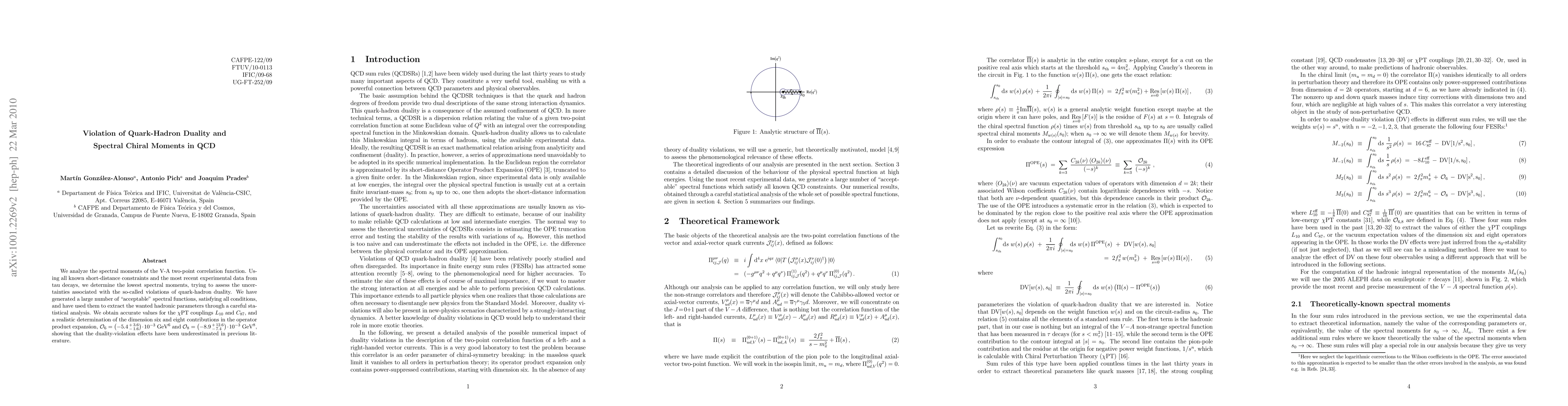 We analyze the spectral moments of the V-A two-point correlation function. Using all known short-distance constraints and the most recent experimental data from tau decays, we determine the lowest spectral moments, trying to assess the uncertainties associated with the so-called violations of quark-hadron duality. We have generated a large number of "acceptable" spectral functions, satisfying all conditions, and have used them to extract the wanted hadronic parameters through a careful statistical analysis. We obtain accurate values for the ChPT couplings L10 and C87, and a realistic determination of the dimension six and eight contributions in the operator product expansion, O6=(-5.4^{+3.6}_{-1.6})*10^-3 GeV^6 and O8=(-8.9^{+12.6}_{-7.4})*10^-3 GeV^8, showing that the duality-violation effects have been usually underestimated in previous literature.
