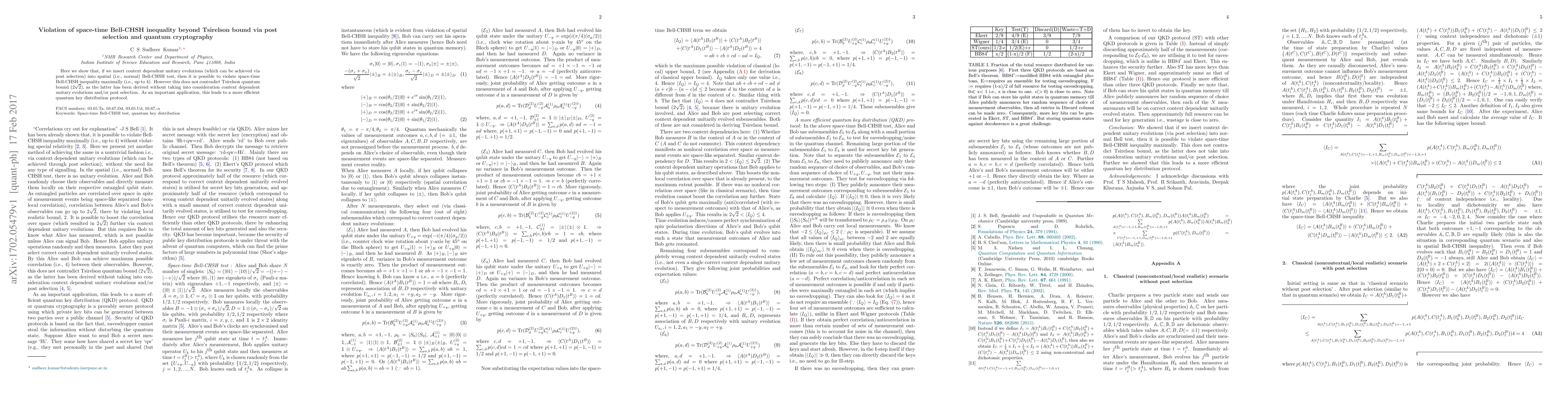 Here we show that, if we insert context dependent unitary evolutions (which can be achieved via post selection) into spatial (i.e., normal) Bell-CHSH test, then it is possible to violate space-time Bell-CHSH inequality maximally (i.e., up to $4$). However this does not contradict Tsirelson quantum bound ($2\sqrt{2}$), as the latter has been derived without taking into consideration context dependent unitary evolutions and/or post selection. As an important application, this leads to a more efficient quantum key distribution protocol.