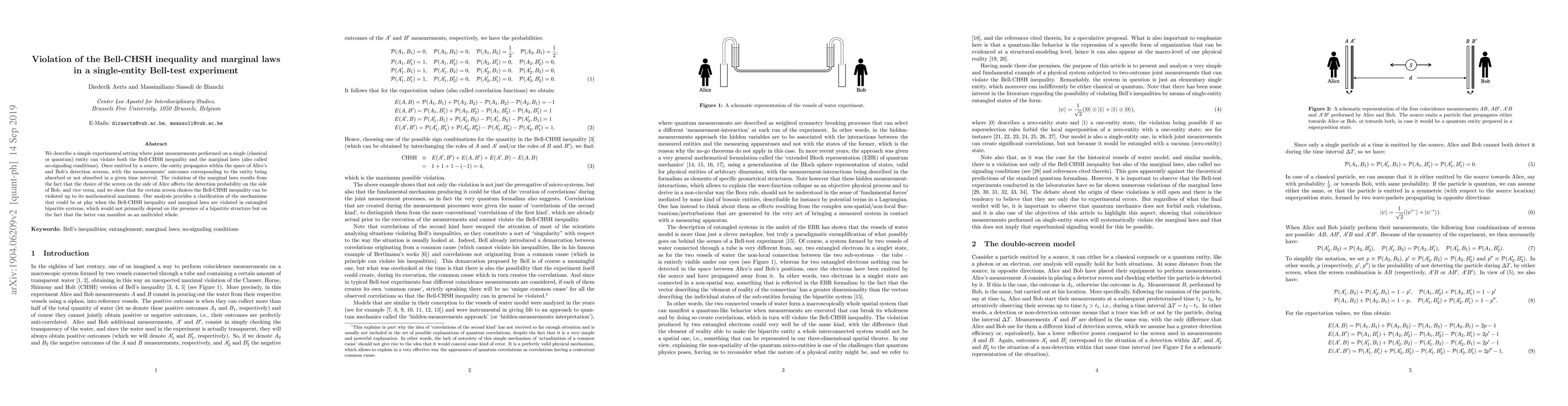We describe a simple experimental setting where joint measurements performed on a single (classical or quantum) entity can violate both the Bell-CHSH inequality and the marginal laws (also called no-signaling conditions). Once emitted by a source, the entity propagates within the space of Alice's and Bob's detection screens, with the measurements' outcomes corresponding to the entity being absorbed or not absorbed in a given time interval. The violation of the marginal laws results from the fact that the choice of the screen on the side of Alice affects the detection probability on the side of Bob, and vice versa, and we show that for certain screen choices the Bell-CHSH inequality can be violated up to its mathematical maximum. Our analysis provides a clarification of the mechanisms that could be at play when the Bell-CHSH inequality and marginal laws are violated in entangled bipartite systems, which would not primarily depend on the presence of a bipartite structure but on the fact that the latter can manifest as an undivided whole.