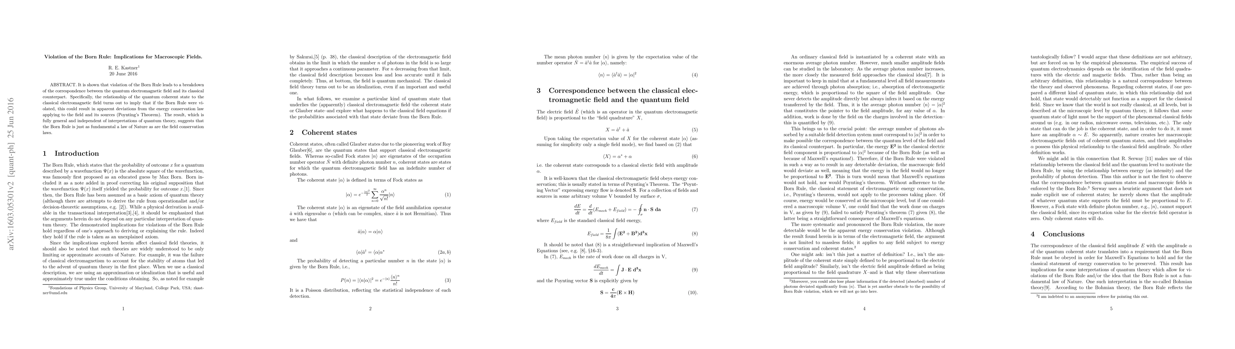 Summary: The paper demonstrates that violating the Born Rule disrupts the correspondence between quantum and classical electromagnetic fields, potentially leading to deviations from energy conservation laws. It underscores the Born Rule's fundamental importance alongside conservation laws.