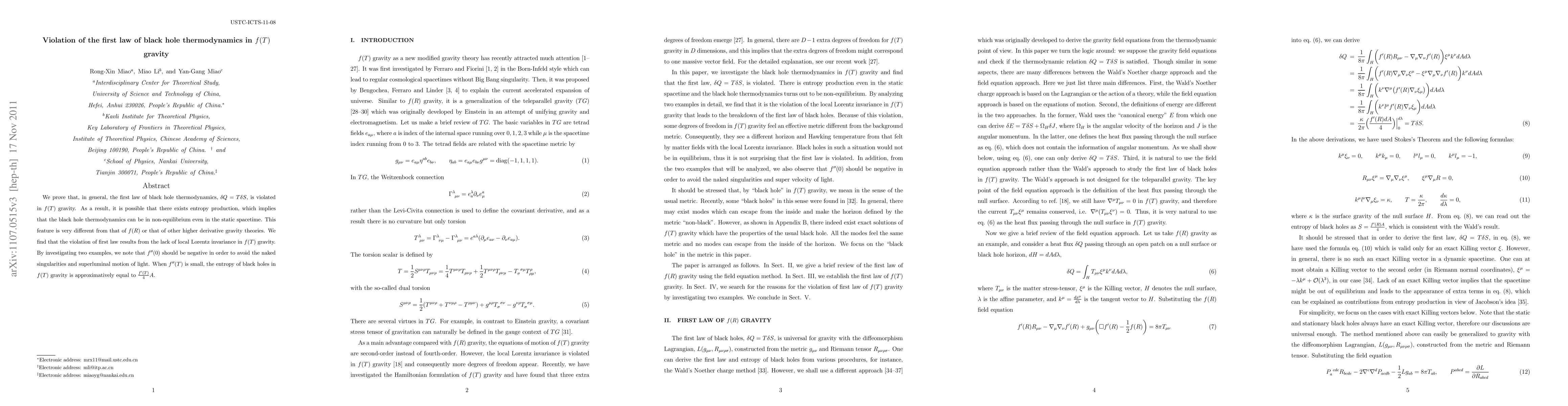 We prove that, in general, the first law of black hole thermodynamics, $\delta Q=T\delta S$, is violated in $f(T)$ gravity. As a result, it is possible that there exists entropy production, which implies that the black hole thermodynamics can be in non-equilibrium even in the static spacetime. This feature is very different from that of $f(R)$ or that of other higher derivative gravity theories. We find that the violation of first law results from the lack of local Lorentz invariance in $f(T)$ gravity. By investigating two examples, we note that $f"(0)$ should be negative in order to avoid the naked singularities and superluminal motion of light. When $f"(T)$ is small, the entropy of black holes in $f(T)$ gravity is approximatively equal to $\frac{f'(T)}{4}A$.