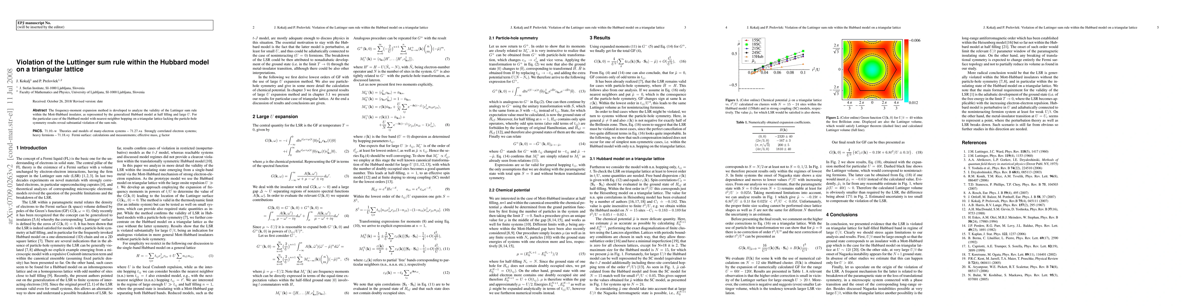 Summary: The frequency-moment expansion method reveals a significant violation of the Luttinger sum rule in the Hubbard model on a triangular lattice, despite the system being a Mott-Hubbarbar insulator with large on-site repulsion. This finding challenges the applicability of the sum rule in systems lacking particle-hole symmetry.