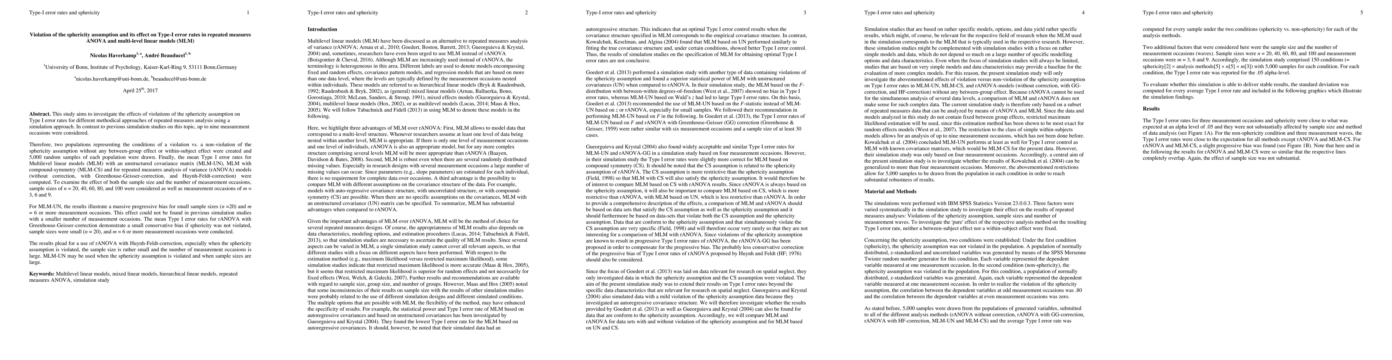 This study aims to investigate the effects of violations of the sphericity assumption on Type I error rates for different methodical approaches of repeated measures analysis using a simulation approach. In contrast to previous simulation studies on this topic, up to nine measurement occasions were considered. Therefore, two populations representing the conditions of a violation vs. a non-violation of the sphericity assumption without any between-group effect or within-subject effect were created and 5,000 random samples of each population were drawn. Finally, the mean Type I error rates for Multilevel linear models (MLM) with an unstructured covariance matrix (MLM-UN), MLM with compound-symmetry (MLM-CS) and for repeated measures analysis of variance (rANOVA) models (without correction, with Greenhouse-Geisser-correction, and Huynh-Feldt-correction) were computed. To examine the effect of both the sample size and the number of measurement occasions, sample sizes of n = 20, 40, 60, 80, and 100 were considered as well as measurement occasions of m = 3, 6 and 9. For MLM-UN, the results illustrate a massive progressive bias for small sample sizes (n =20) and m = 6 or more measurement occasions. This effect could not be found in previous simulation studies with a smaller number of measurement occasions. The mean Type I error rates for rANOVA with Greenhouse-Geisser-correction demonstrate a small conservative bias if sphericity was not violated, sample sizes were small (n = 20), and m = 6 or more measurement occasions were conducted. The results plead for a use of rANOVA with Huynh-Feldt-correction, especially when the sphericity assumption is violated, the sample size is rather small and the number of measurement occasions is large. MLM-UN may be used when the sphericity assumption is violated and when sample sizes are large.