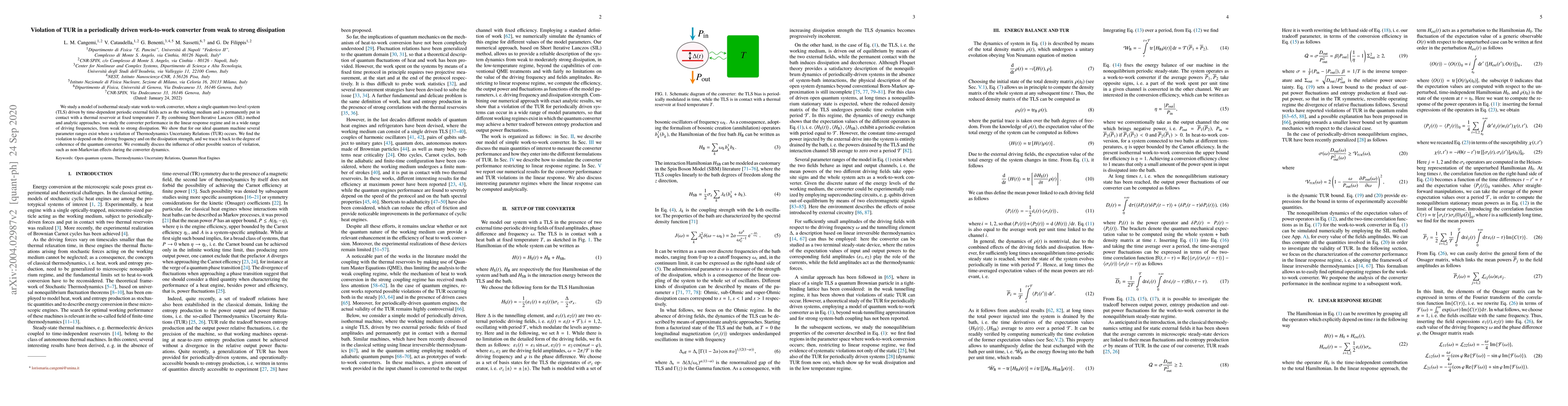 This paper investigates a quantum two-level system used as a work-to-work converter, driven by periodic fields, and finds that it violates the Thermodynamics Uncertainty Relations (TUR) under certain conditions. The study reveals that the degree of coherence and driving frequency influence the extent of TUR violation, with non-Markovian effects also playing a role.