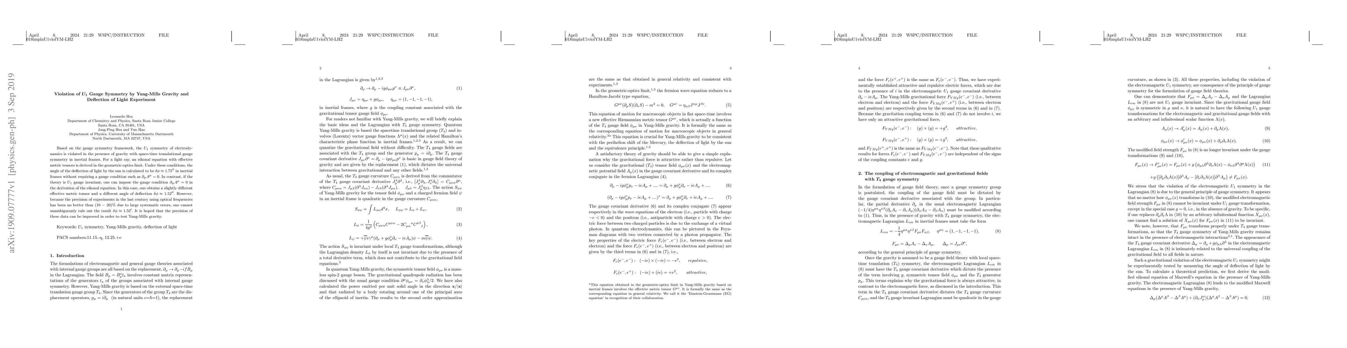 This research demonstrates that $U_1$ gauge symmetry in electrodynamics is violated in the presence of gravity, leading to a calculated deflection angle of light by the sun of approximately 1.75''. It contrasts this with a $U_1$ gauge invariant theory, which yields a slightly different deflection angle of about 1.52'', emphasizing the need for improved experimental precision to test Yang-Mills gravity theories.
