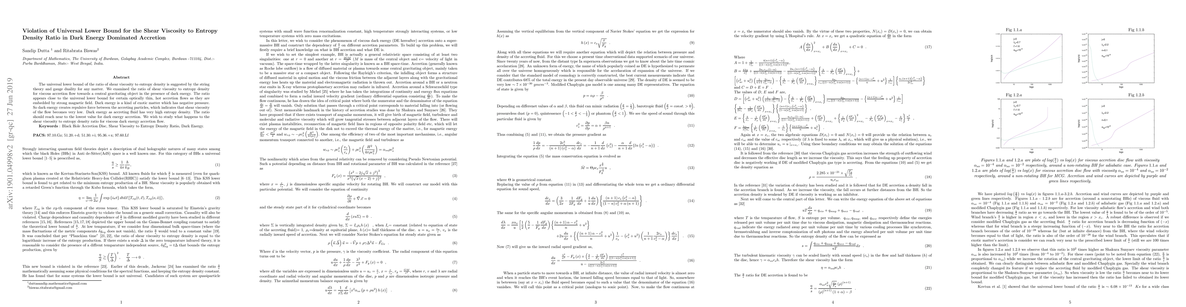 The universal lower bound of the ratio of shear viscosity to entropy density is suggested by the string theory and gauge duality for any matter. We examined the ratio of shear viscosity to entropy density for viscous accretion flow towards a central gravitating object in the presence of dark energy. The ratio appears close to the universal lower bound for certain optically thin, hot accretion flows as they are embedded by strong magnetic field. Dark energy is a kind of exotic matter which has negative pressure. So dark energy creates repulsive force between the accreting particles, which indicates that shear viscosity of the flow becomes very low. Dark energy as accreting fluid has very high entropy density. The ratio should reach near to the lowest value for dark energy accretion. We wish to study what happens to the shear viscosity to entropy density ratio for viscous dark energy accretion flow.