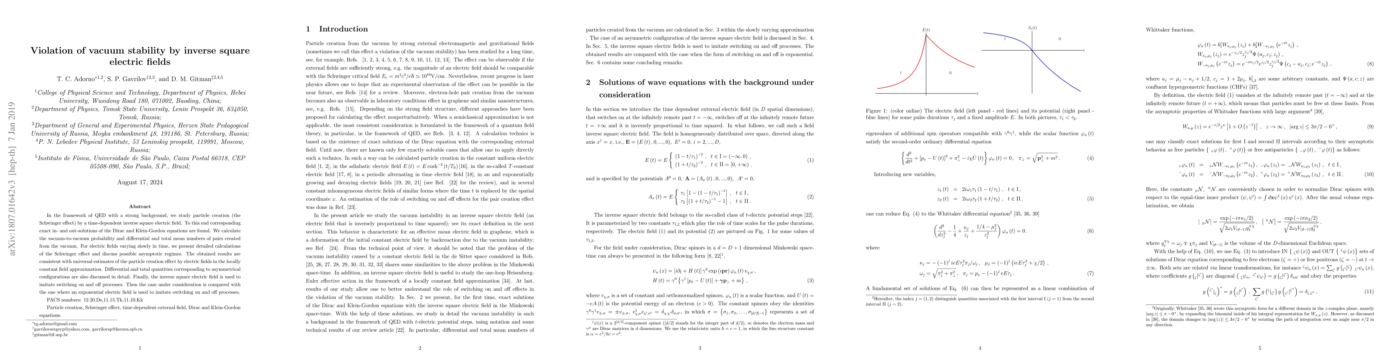 In the framework of QED with a strong background, we study particle creation (the Schwinger effect) by a time-dependent inverse square electric field. To this end corresponding exact in- and out-solutions of the Dirac and Klein-Gordon equations are found. We calculate the vacuum-to-vacuum probability and differential and total mean numbers of pairs created from the vacuum. For electric fields varying slowly in time, we present detailed calculations of the Schwinger effect and discuss possible asymptotic regimes. The obtained results are consistent with universal estimates of the particle creation effect by electric fields in the locally constant field approximation. Differential and total quantities corresponding to asymmetrical configurations are also discussed in detail. Finally, the inverse square electric field is used to imitate switching on and off processes. Then the case under consideration is compared with the one where an exponential electric field is used to imitate switching on and off processes.