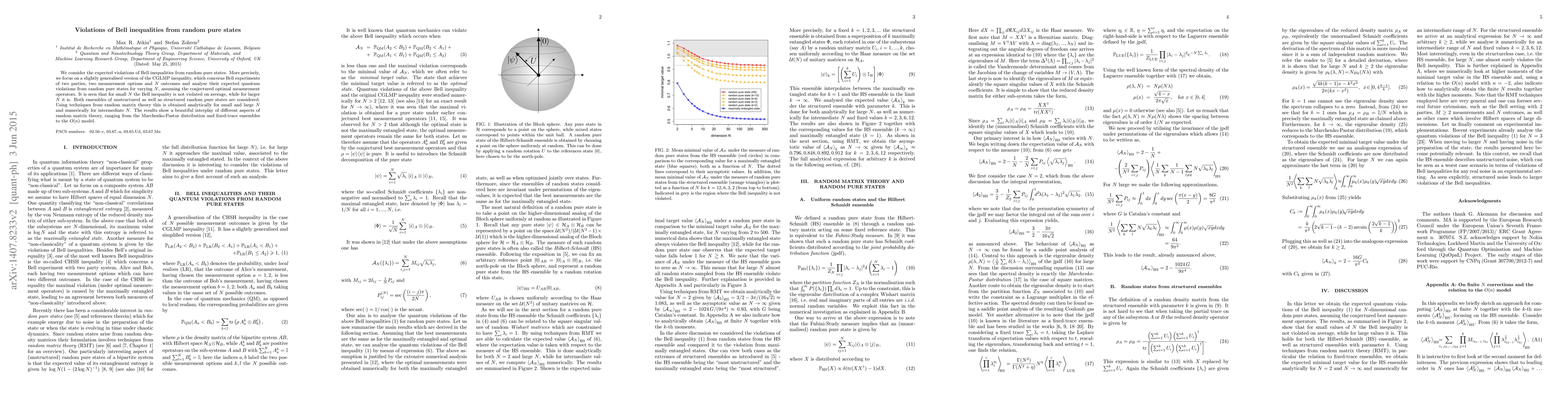 This paper investigates the expected violations of a generalised Bell inequality from random pure states, showing that small values of N do not violate the inequality on average, but larger N do. Analytical and numerical methods from random matrix theory reveal this transition, highlighting connections to various random matrix models.