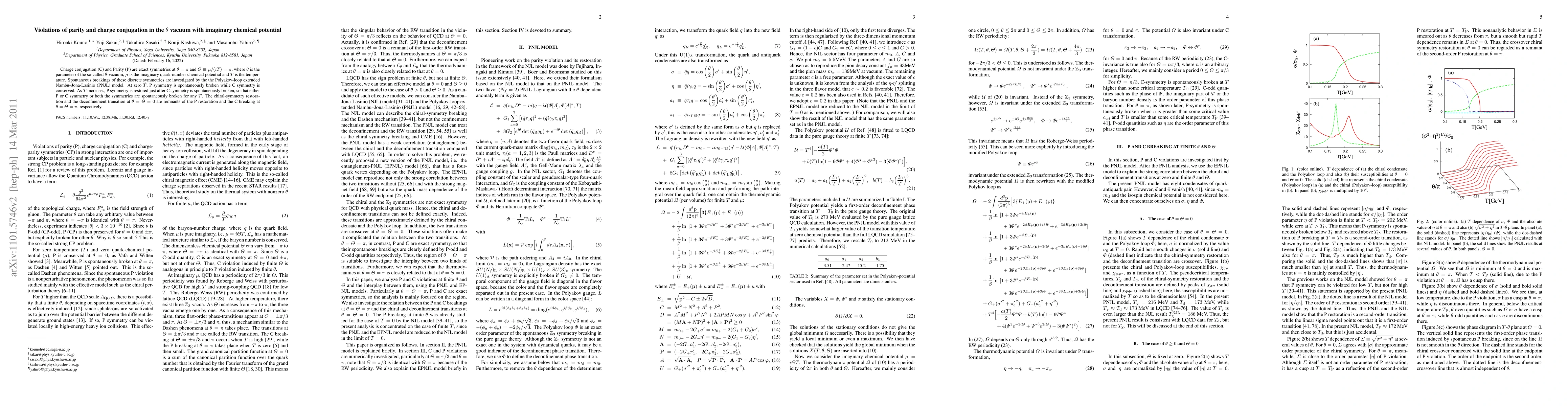 Charge conjugation (C) and Parity (P) are exact symmetries at theta =pi and Theta = mu/(iT)=pi, where theta is the parameter of the so-called theta-vacuum, mu is the imaginary quark-number chemical potential and T is the temperature. Spontaneous breakings of these discrete symmetries are investigated by the the Polyakov-loop extended Nambu--Jona-Lasinio (PNJL) model. At zero T, P symmetry is spontaneously broken while C symmetry is conserved. As T increases, P symmetry is restored just after C symmetry is spontaneously broken, so that either P or C symmetry or both the symmetries are spontaneously broken for any T. The chiral-symmetry restoration and the deconfinement transition at theta =Theta =0 are remnants of the P restoration and the C breaking at theta =Theta =pi, respectively.