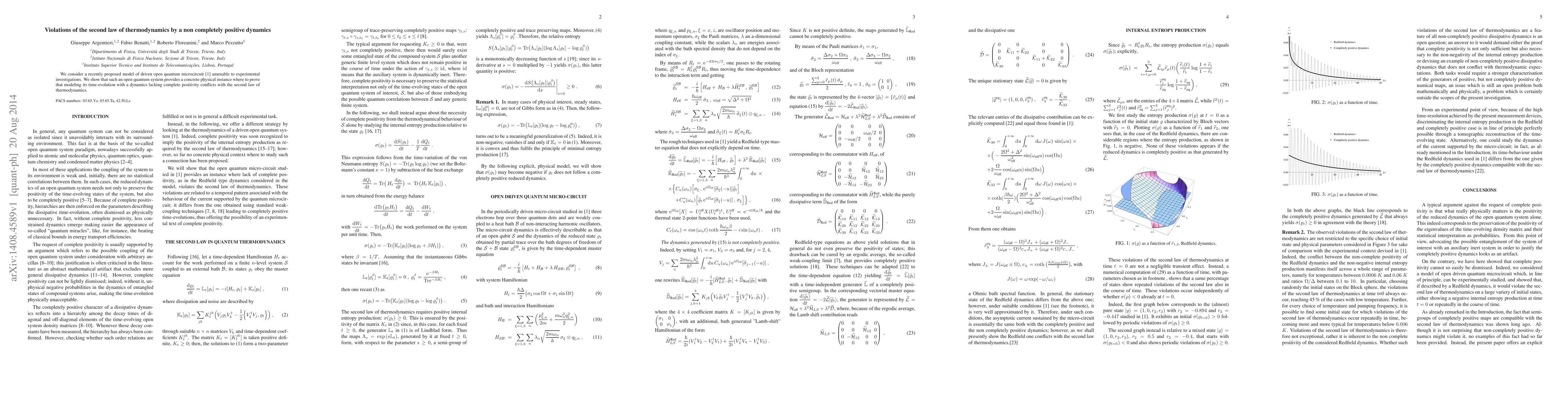 This paper demonstrates that a driven open quantum microcircuit model, lacking complete positivity in its dynamics, violates the second law of thermodynamics, providing a physical instance of this conflict. The findings challenge conventional modeling approaches for such quantum systems.