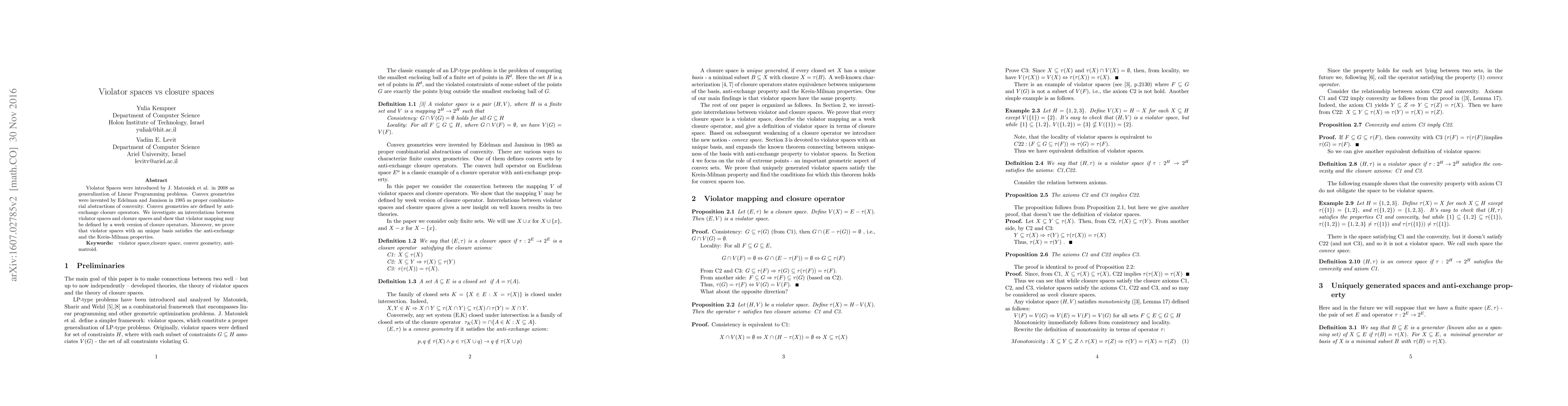 Summary: This paper explores the relationship between violator spaces and closure spaces, demonstrating that violator mappings can be defined via a weak version of closure operators. It also proves that violator spaces with a unique basis fulfill anti-exchange and Krein-Milman properties.