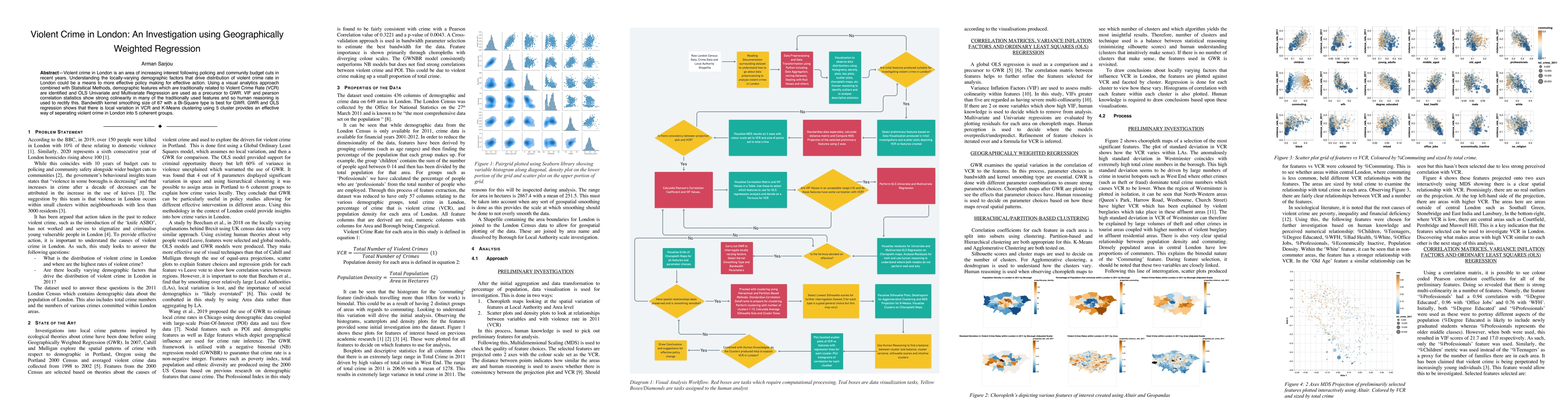 Violent crime in London is an area of increasing interest following policing and community budget cuts in recent years. Understanding the locally-varying demographic factors that drive distribution of violent crime rate in London could be a means to more effective policy making for effective action. Using a visual analytics approach combined with Statsitical Methods, demographic features which are traditionally related to Violent Crime Rate (VCR) are identified and OLS Univariate and Multivariate Regression are used as a precursor to GWR. VIF and pearson correlation statistics show strong colinearity in many of the traditionally used features and so human reasoning is used to rectify this. Bandwidth kernel smoothing size of 67 with a Bi-Square type is best for GWR. GWR and OLS regression shows that there is local variation in VCR and K-Means clustering using 5 clusters provides an effective way of seperating violent crime in London into 5 coherent groups.