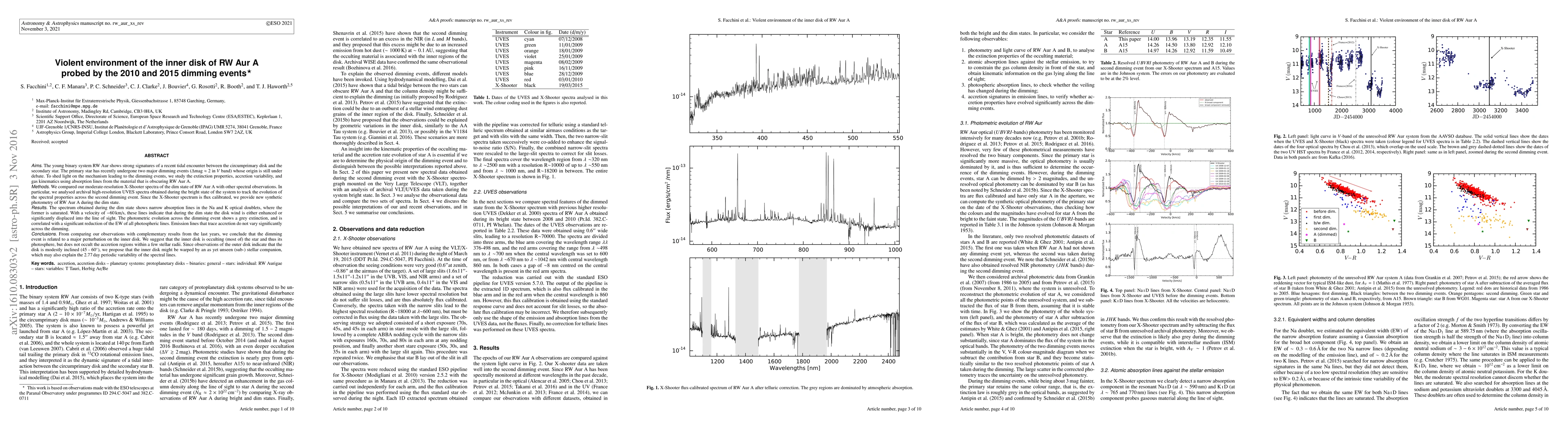RW Aur is a young binary system showing strong signatures of a recent tidal encounter between the circumprimary disk and the secondary star. The primary star has recently undergone two major dimming events ($\Delta$mag $\approx$ 2 in V-band), whose origin is still under debate. To shed light on the mechanism leading to the dimming events, we study the extinction properties, accretion variability, and gas kinematics using absorption lines from the material obscuring star RW Aur A. We compare our moderate resolution X-Shooter spectra of the dim state of RW Aur A with other spectral observations. In particular, we analyse archival high resolution UVES spectra obtained during the bright state of the system, in order to track the evolution of the spectral properties across the second dimming event. The spectrum obtained during the dim state shows narrow absorption lines in the Na and K optical doublets, where the former is saturated. With a velocity of -60 km/s these lines indicate that during the dim state the disk wind is either enhanced, or significantly displaced into the line of sight. The photometric evolution across the dimming event shows a gray extinction, and is correlated with a significant reduction of the EW of all photospheric lines. Emission lines tracing accretion do not vary significantly across the dimming. We conclude that the dimming event is related to a major perturbation on the inner disk. We suggest that the inner disk is occulting (most of) the star, and thus its photosphere, but is not occulting the accretion regions within a few stellar radii. Since observations of the outer disk indicate that the disk is modestly inclined (45 - 60 deg), we propose that the inner disk might be warped by a yet unseen (sub-)stellar companion, which may also explain the 2.77 day periodic variability of the spectral lines.
