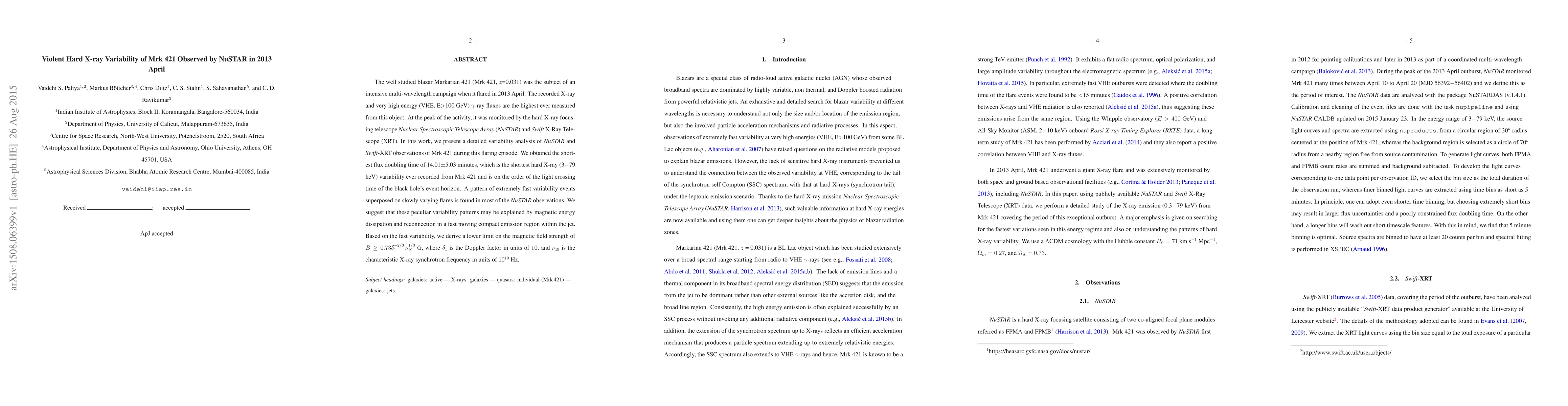 The study analyzed Mrk 421's X-ray variability during a 2013 flare, discovering extremely fast variability events that suggest magnetic energy dissipation and reconnection in the jet. The analysis revealed record-breaking hard X-ray fluxes and a lower limit on magnetic field strength.