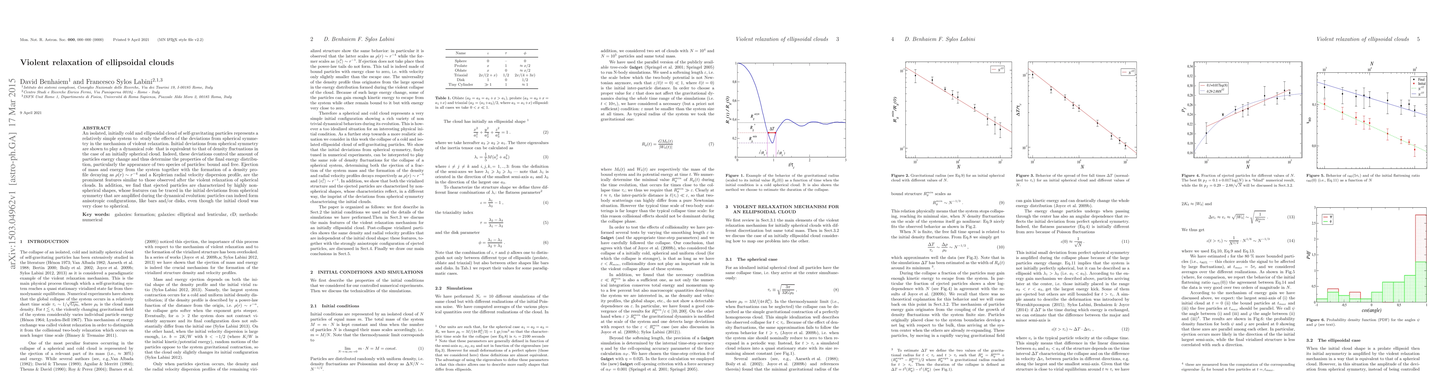 This paper explores the violent relaxation of ellipsoidal clouds, demonstrating that initial deviations from spherical symmetry significantly influence the energy distribution and particle dynamics. The study finds that these deviations lead to the formation of bound and free particle species, ejection of mass, and the emergence of anisotropic structures like bars and disks.