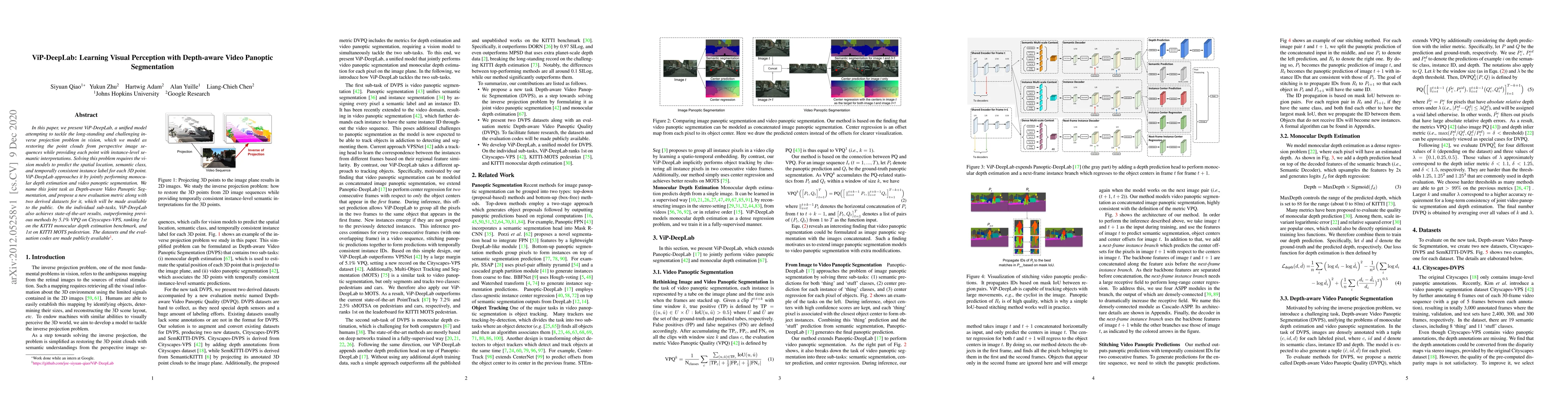 ViP-DeepLab tackles the inverse projection problem by jointly performing monocular depth estimation and video panoptic segmentation, achieving state-of-the-art results on multiple benchmarks. It introduces a new evaluation metric and datasets for Depth-aware Video Panoptic Segmentation.