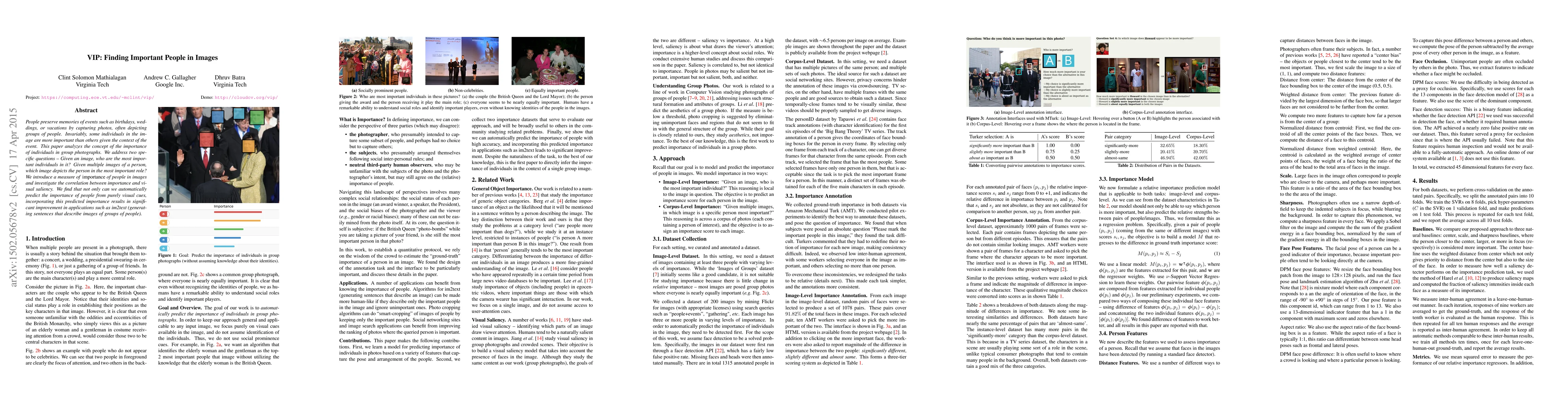 This paper introduces a method to automatically predict the importance of individuals in group photographs based on visual cues, improving applications like image description.