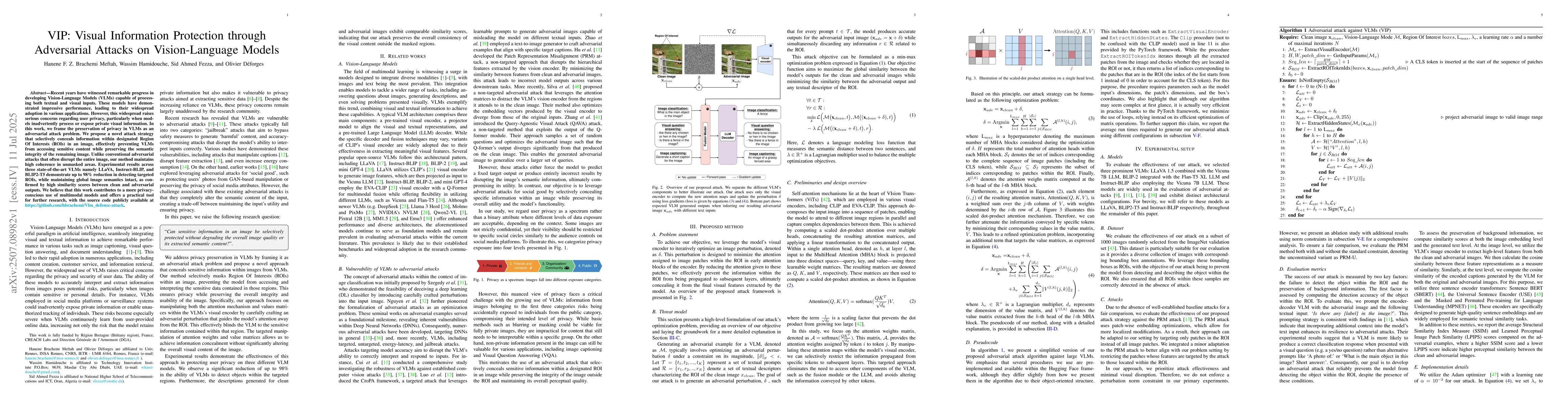 Recent years have witnessed remarkable progress in developing Vision-Language Models (VLMs) capable of processing both textual and visual inputs. These models have demonstrated impressive performance, leading to their widespread adoption in various applications. However, this widespread raises serious concerns regarding user privacy, particularly when models inadvertently process or expose private visual information. In this work, we frame the preservation of privacy in VLMs as an adversarial attack problem. We propose a novel attack strategy that selectively conceals information within designated Region Of Interests (ROIs) in an image, effectively preventing VLMs from accessing sensitive content while preserving the semantic integrity of the remaining image. Unlike conventional adversarial attacks that often disrupt the entire image, our method maintains high coherence in unmasked areas. Experimental results across three state-of-the-art VLMs namely LLaVA, Instruct-BLIP, and BLIP2-T5 demonstrate up to 98% reduction in detecting targeted ROIs, while maintaining global image semantics intact, as confirmed by high similarity scores between clean and adversarial outputs. We believe that this work contributes to a more privacy conscious use of multimodal models and offers a practical tool for further research, with the source code publicly available at: https://github.com/hbrachemi/Vlm_defense-attack.