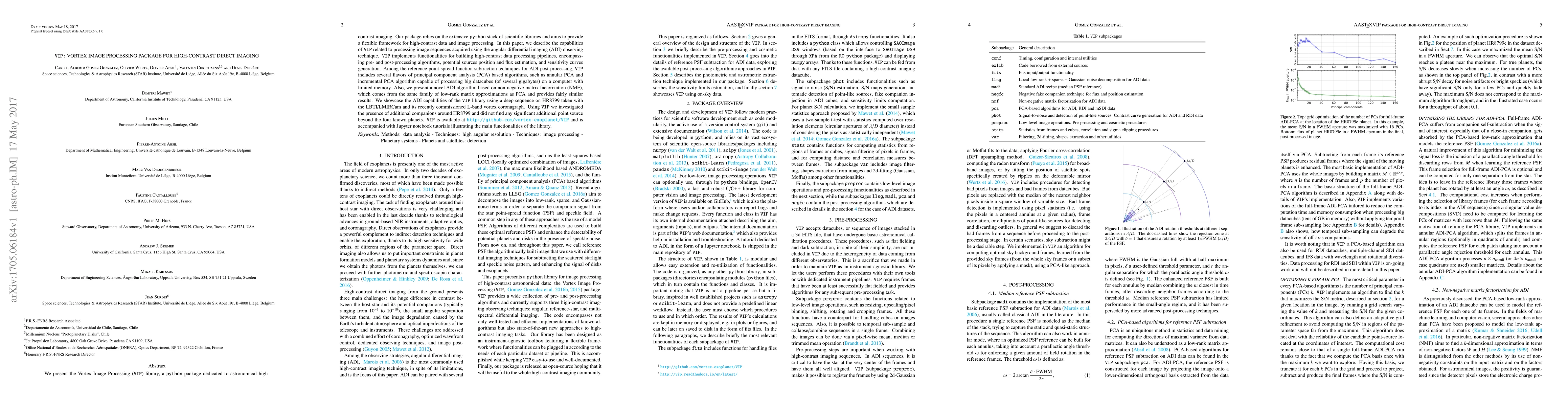 The VIP library is a Python package for high-contrast astronomical imaging, offering tools for processing image sequences from angular differential imaging (ADI). It includes PCA-based algorithms and a novel NMF method for analyzing large datacubes, and was tested on HR8799 data without finding additional companions.