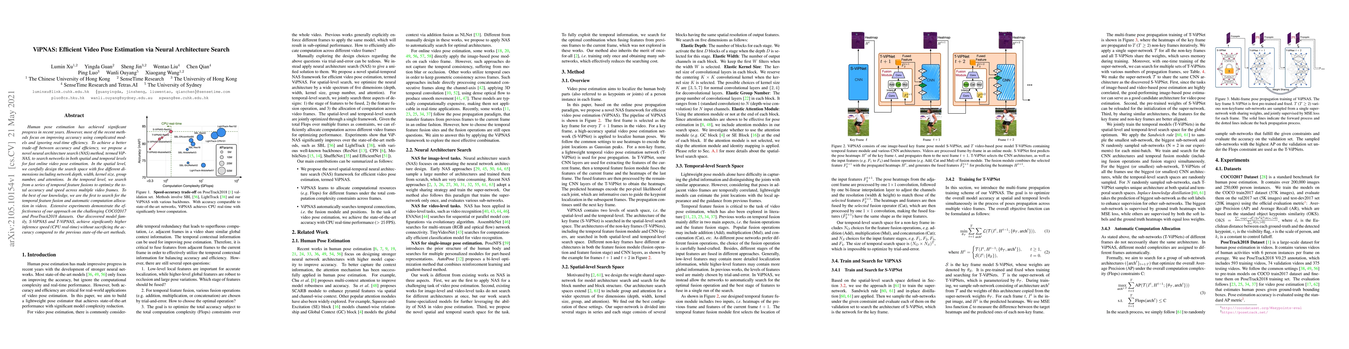 This paper proposes ViPNAS, a neural architecture search method for efficient real-time video pose estimation, balancing accuracy and speed by optimizing both spatial and temporal features. The method achieves significantly higher inference speeds on datasets like COCO2017 and PoseTrack2018 without compromising accuracy compared to existing methods.