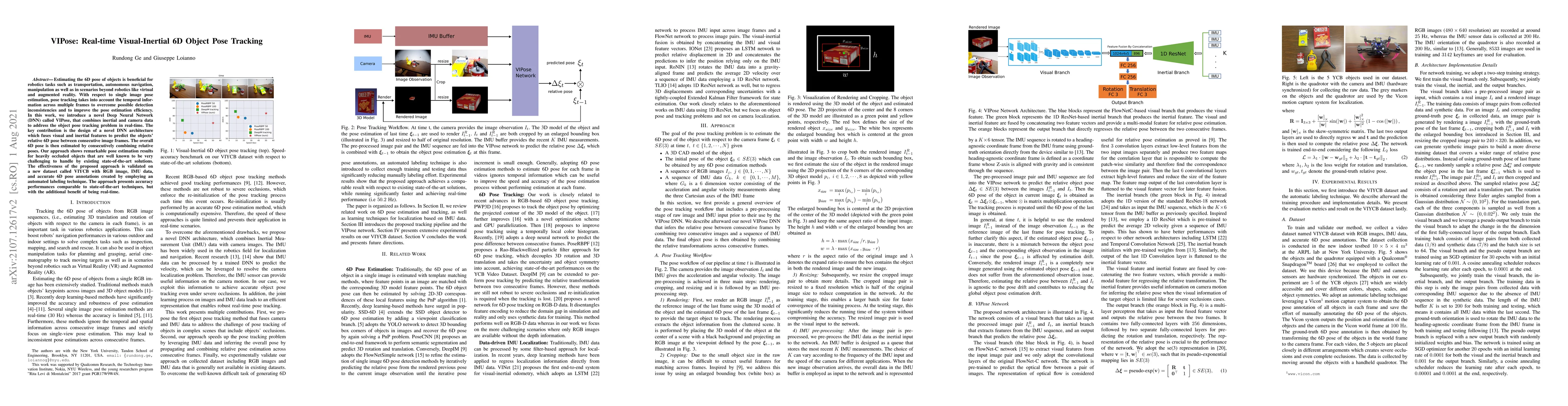 VIPose introduces a novel DNN architecture that fuses visual and inertial data for real-time 6D object pose tracking, achieving high accuracy even for heavily occluded objects, validated on a new dataset VIYCB. It demonstrates real-time performance comparable to state-of-the-art methods.