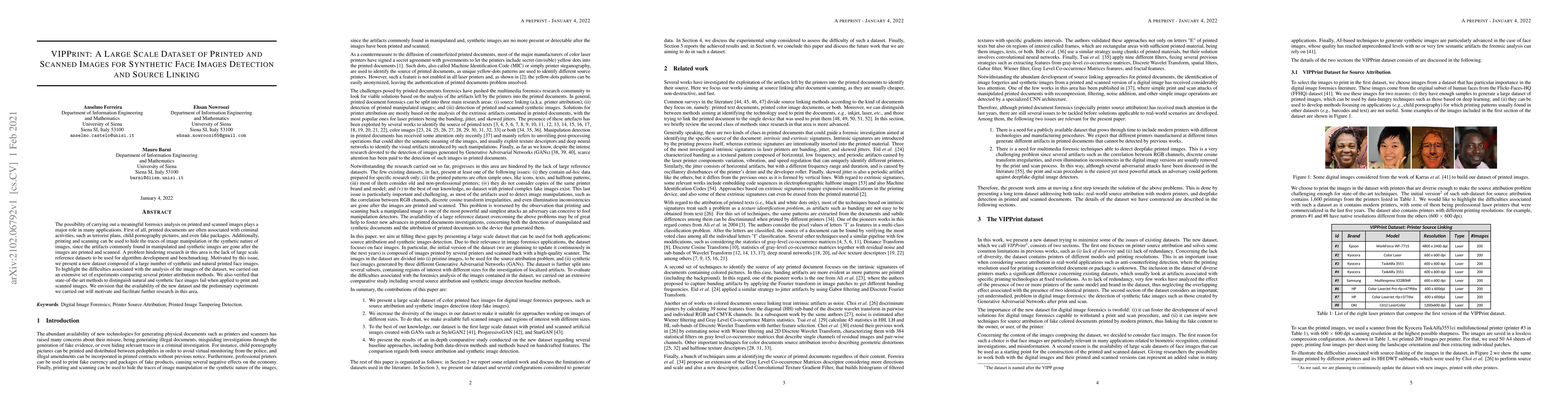 The possibility of carrying out a meaningful forensics analysis on printed and scanned images plays a major role in many applications. First of all, printed documents are often associated with criminal activities, such as terrorist plans, child pornography pictures, and even fake packages. Additionally, printing and scanning can be used to hide the traces of image manipulation or the synthetic nature of images, since the artifacts commonly found in manipulated and synthetic images are gone after the images are printed and scanned. A problem hindering research in this area is the lack of large scale reference datasets to be used for algorithm development and benchmarking. Motivated by this issue, we present a new dataset composed of a large number of synthetic and natural printed face images. To highlight the difficulties associated with the analysis of the images of the dataset, we carried out an extensive set of experiments comparing several printer attribution methods. We also verified that state-of-the-art methods to distinguish natural and synthetic face images fail when applied to print and scanned images. We envision that the availability of the new dataset and the preliminary experiments we carried out will motivate and facilitate further research in this area.