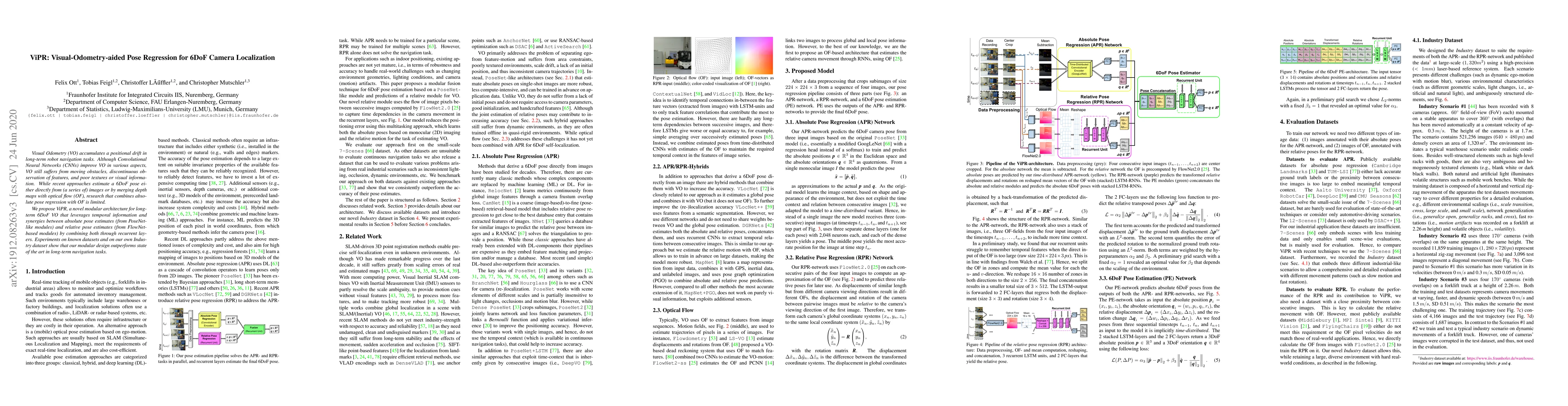 Visual Odometry (VO) accumulates a positional drift in long-term robot navigation tasks. Although Convolutional Neural Networks (CNNs) improve VO in various aspects, VO still suffers from moving obstacles, discontinuous observation of features, and poor textures or visual information. While recent approaches estimate a 6DoF pose either directly from (a series of) images or by merging depth maps with optical flow (OF), research that combines absolute pose regression with OF is limited. We propose ViPR, a novel modular architecture for long-term 6DoF VO that leverages temporal information and synergies between absolute pose estimates (from PoseNet-like modules) and relative pose estimates (from FlowNet-based modules) by combining both through recurrent layers. Experiments on known datasets and on our own Industry dataset show that our modular design outperforms state of the art in long-term navigation tasks.