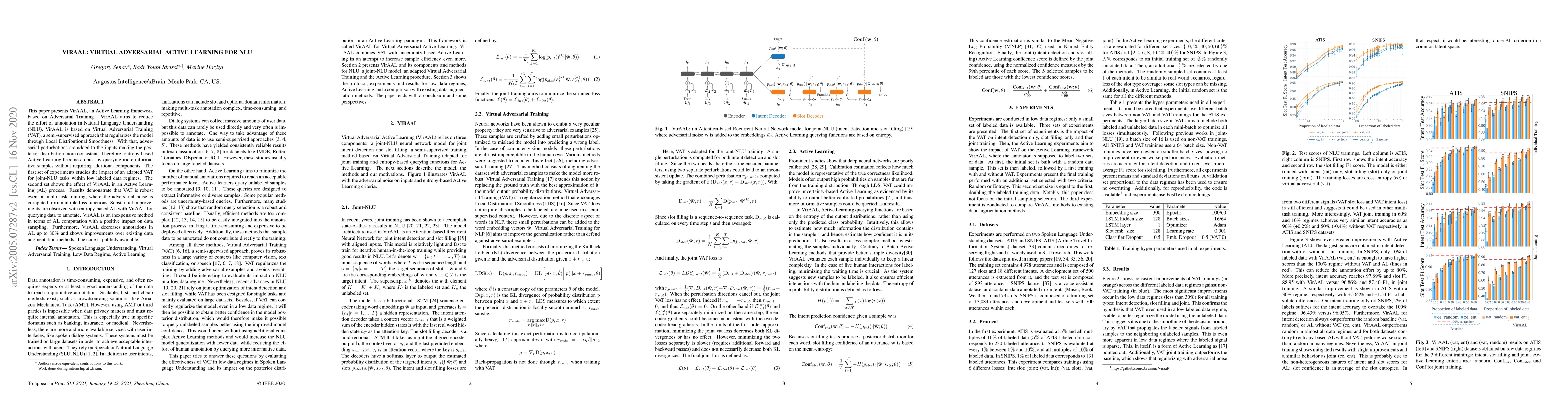 The paper introduces VirAAL, an Active Learning framework that leverages Virtual Adversarial Training (VAT) to minimize annotation effort in Natural Language Understanding (NLU). VirAAL enhances entropy-based Active Learning by making it robust to query more informative samples without extra components. Experiments show VirAAL improves data sampling, reduces annotation needs by up to 80%, and outperforms existing data augmentation methods. The code is publicly available.