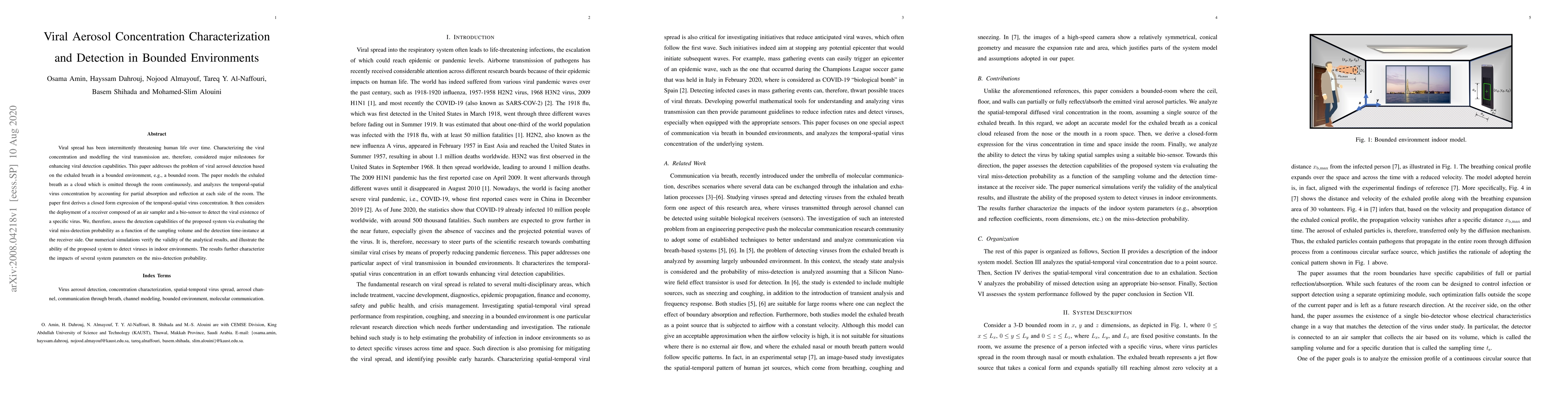 Viral spread has been intermittently threatening human life over time. Characterizing the viral concentration and modelling the viral transmission are, therefore, considered major milestones for enhancing viral detection capabilities. This paper addresses the problem of viral aerosol detection based on the exhaled breath in a bounded environment, e.g., a bounded room. The paper models the exhaled breath as a cloud which is emitted through the room continuously, and analyzes the temporal-spatial virus concentration by accounting for partial absorption and reflection at each side of the room. The paper first derives a closed form expression of the temporal-spatial virus concentration. It then considers the deployment of a receiver composed of an air sampler and a bio-sensor to detect the viral existence of a specific virus. We, therefore, assess the detection capabilities of the proposed system via evaluating the viral miss-detection probability as a function of the sampling volume and the detection time-instance at the receiver side. Our numerical simulations verify the validity of the analytical results, and illustrate the ability of the proposed system to detect viruses in indoor environments. The results further characterize the impacts of several system parameters on the miss-detection probability.