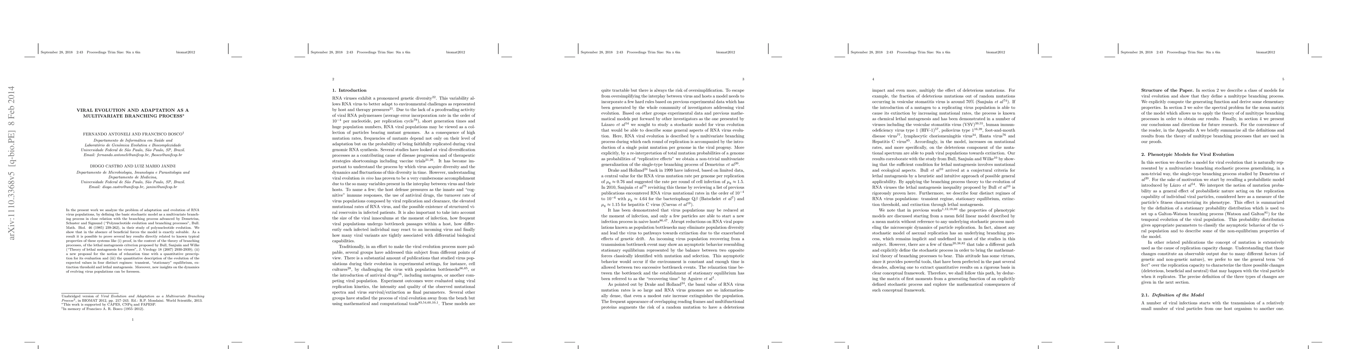 In the present work we analyze the problem of adaptation and evolution of RNA virus populations, by defining the basic stochastic model as a multivariate branching process in close relation with the branching process advanced by Demetrius, Schuster and Sigmund ("Polynucleotide evolution and branching processes", Bull. Math. Biol. 46 (1985) 239-262), in their study of polynucleotide evolution. We show that in the absence of beneficial forces the model is exactly solvable. As a result it is possible to prove several key results directly related to known typical properties of these systems like (i) proof, in the context of the theory of branching processes, of the lethal mutagenesis criterion proposed by Bull, Sanju\'an and Wilke ("Theory of lethal mutagenesis for viruses", J. Virology 18 (2007) 2930-2939); (ii) a new proposal for the notion of relaxation time with a quantitative prescription for its evaluation and (iii) the quantitative description of the evolution of the expected values in four distinct regimes: transient, "stationary" equilibrium, extinction threshold and lethal mutagenesis. Moreover, new insights on the dynamics of evolving virus populations can be foreseen.