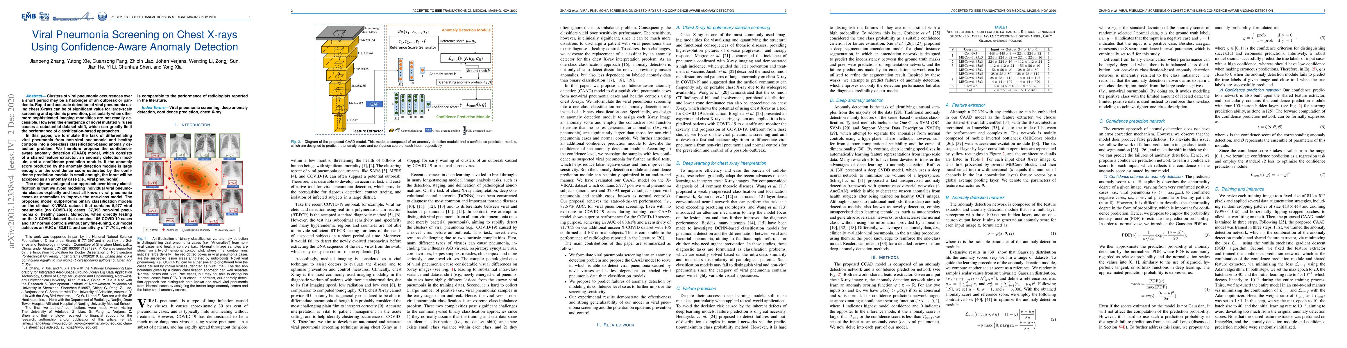 This paper proposes a confidence-aware anomaly detection (CAAD) model for rapid screening of viral pneumonia on chest X-ray images, treating viral pneumonia as anomalies. The CAAD model outperforms binary classification methods by avoiding explicit modeling of individual viral pneumonia classes, thus effectively handling dataset shifts due to evolving viruses.
