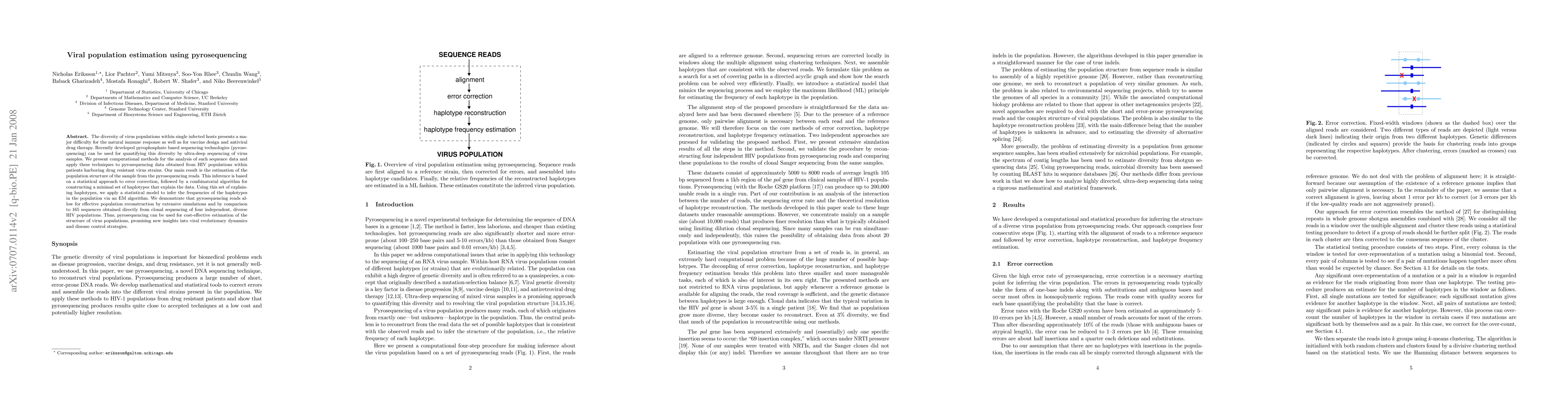 This paper presents computational methods for analyzing ultra-deep pyrosequencing data to estimate the diversity and population structure of virus populations, specifically HIV, by constructing a minimal set of haplotypes. The approach uses statistical error correction and an EM algorithm to infer haplotype frequencies, demonstrating its effectiveness through simulations and comparisons with clonal sequencing data.