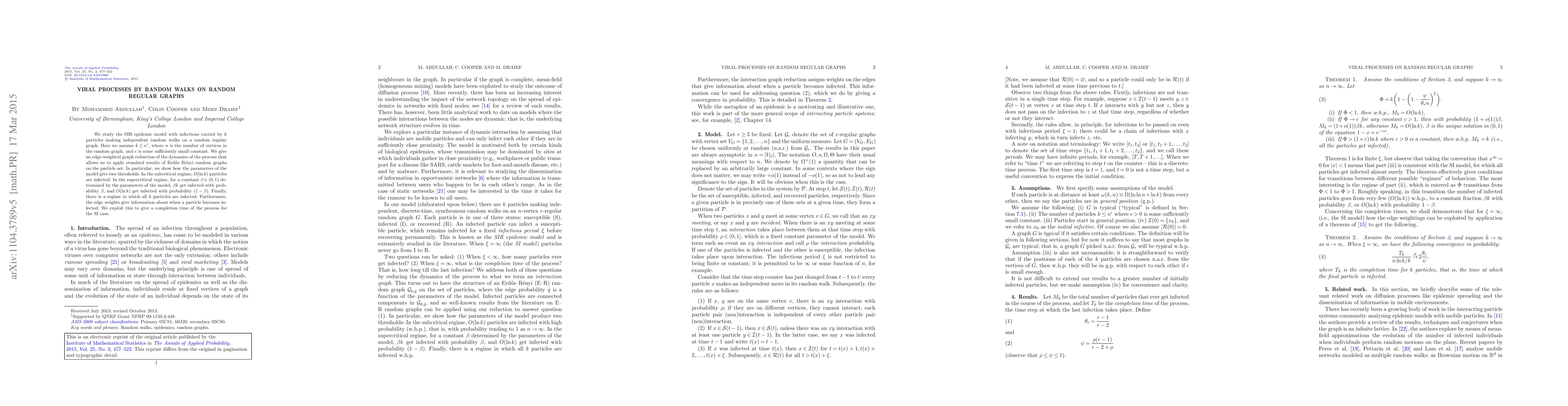We study the SIR epidemic model with infections carried by $k$ particles making independent random walks on a random regular graph. Here we assume $k\leq n^{\epsilon}$, where $n$ is the number of vertices in the random graph, and $\epsilon$ is some sufficiently small constant. We give an edge-weighted graph reduction of the dynamics of the process that allows us to apply standard results of Erd\H{o}s-R\'{e}nyi random graphs on the particle set. In particular, we show how the parameters of the model give two thresholds: In the subcritical regime, $O(\ln k)$ particles are infected. In the supercritical regime, for a constant $\beta\in(0,1)$ determined by the parameters of the model, $\beta k$ get infected with probability $\beta$, and $O(\ln k)$ get infected with probability $(1-\beta)$. Finally, there is a regime in which all $k$ particles are infected. Furthermore, the edge weights give information about when a particle becomes infected. We exploit this to give a completion time of the process for the SI case.