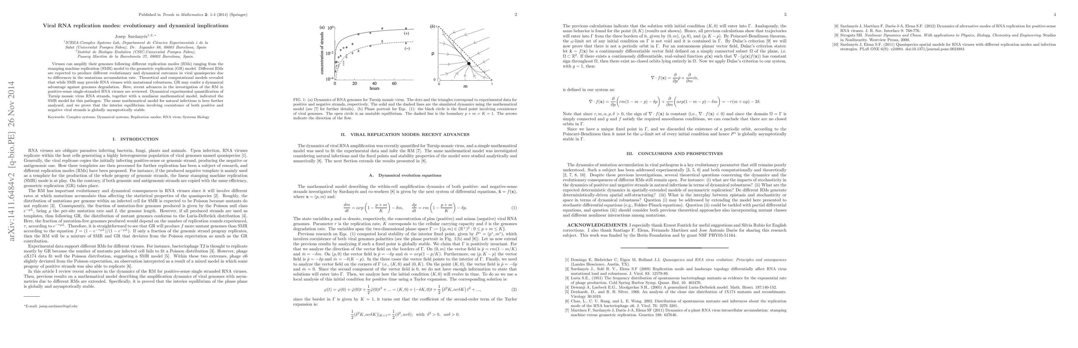 This paper reviews different replication modes of viral RNA, highlighting their evolutionary and dynamical implications. It finds that the stamping machine model offers mutational robustness, while the geometric model provides a dynamical advantage against genome degradation. The study confirms the stamping machine model for Turnip mosaic virus and proves the stability of equilibrium in natural infections.