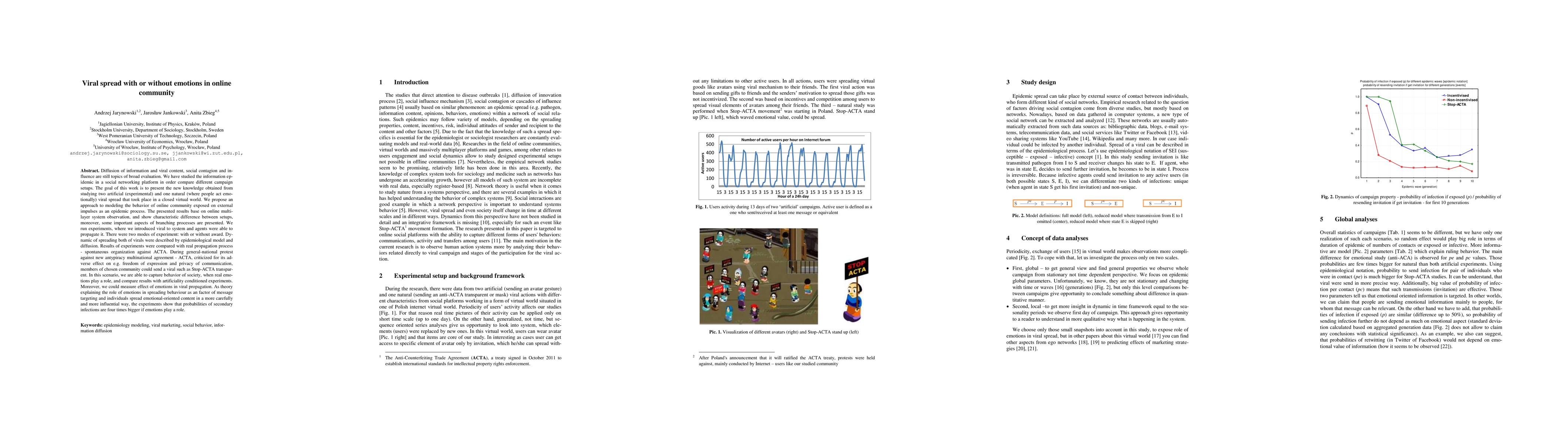 Diffusion of information and viral content, social contagion and influence are still topics of broad evaluation. We have studied the information epidemic in a social networking platform in order compare different campaign setups. The goal of this work is to present the new knowledge obtained from studying two artificial (experimental) and one natural (where people act emotionally) viral spread that took place in a closed virtual world. We propose an approach to modeling the behavior of online community exposed on external impulses as an epidemic process. The presented results base on online multilayer system observation, and show characteristic difference between setups, moreover, some important aspects of branching processes are presented. We run experiments, where we introduced viral to system and agents were able to propagate it. There were two modes of experiment: with or without award. Dynamic of spreading both of virals were described by epidemiological model and diffusion. Results of experiments were compared with real propagation process - spontaneous organization against ACTA. During general-national protest against new antypiracy multinational agreement - ACTA, criticized for its adverse effect on e.g. freedom of expression and privacy of communication, members of chosen community could send a viral such as Stop-ACTA transparent. In this scenario, we are able to capture behavior of society, when real emotions play a role, and compare results with artificiality conditioned experiments. Moreover, we could measure effect of emotions in viral propagation. As theory explaining the role of emotions in spreading behaviour as an factor of message targeting and individuals spread emotional-oriented content in a more carefully and more influential way, the experiments show that probabilities of secondary infections are four times bigger if emotions play a role.