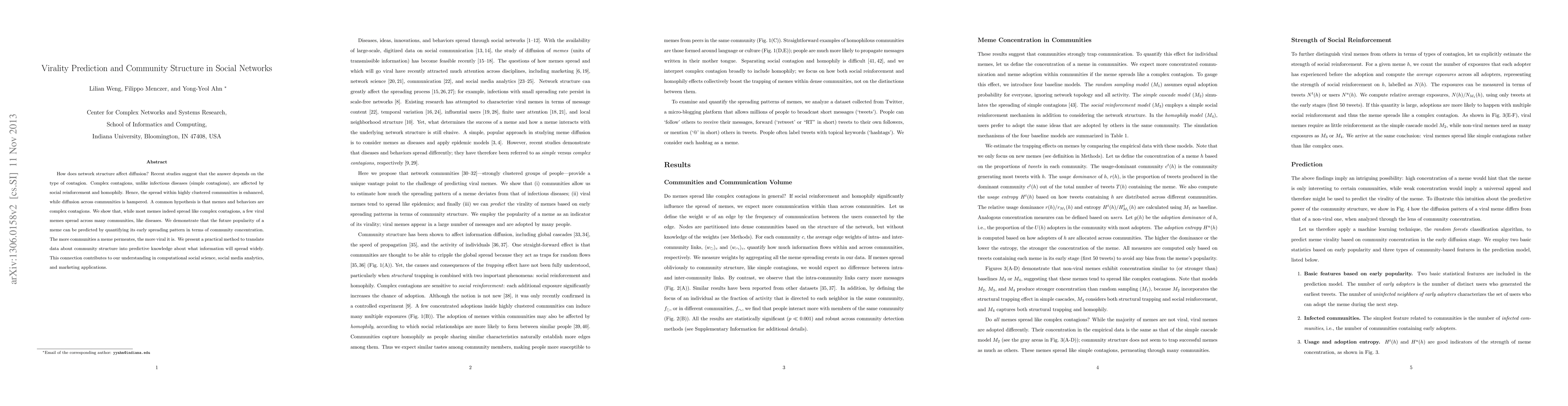 How does network structure affect diffusion? Recent studies suggest that the answer depends on the type of contagion. Complex contagions, unlike infectious diseases (simple contagions), are affected by social reinforcement and homophily. Hence, the spread within highly clustered communities is enhanced, while diffusion across communities is hampered. A common hypothesis is that memes and behaviors are complex contagions. We show that, while most memes indeed behave like complex contagions, a few viral memes spread across many communities, like diseases. We demonstrate that the future popularity of a meme can be predicted by quantifying its early spreading pattern in terms of community concentration. The more communities a meme permeates, the more viral it is. We present a practical method to translate data about community structure into predictive knowledge about what information will spread widely. This connection may lead to significant advances in computational social science, social media analytics, and marketing applications.