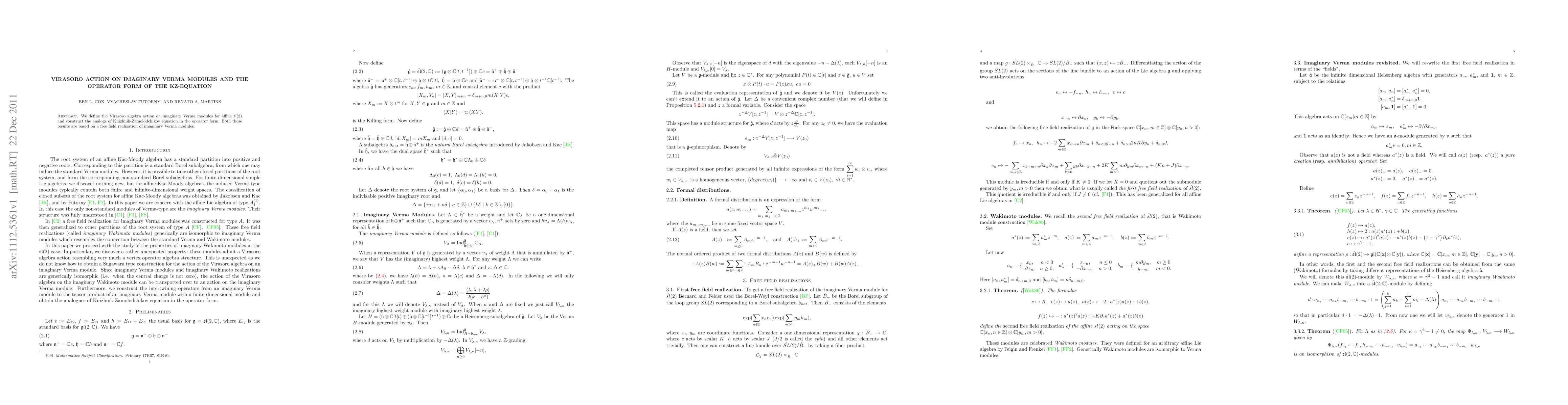 Summary: This paper defines the Virasoro algebra action on imaginary Verma modules for affine sl(2) and constructs operator forms of the Knizhnik-Zamolodchikov equation, utilizing a free field realization of these modules.
