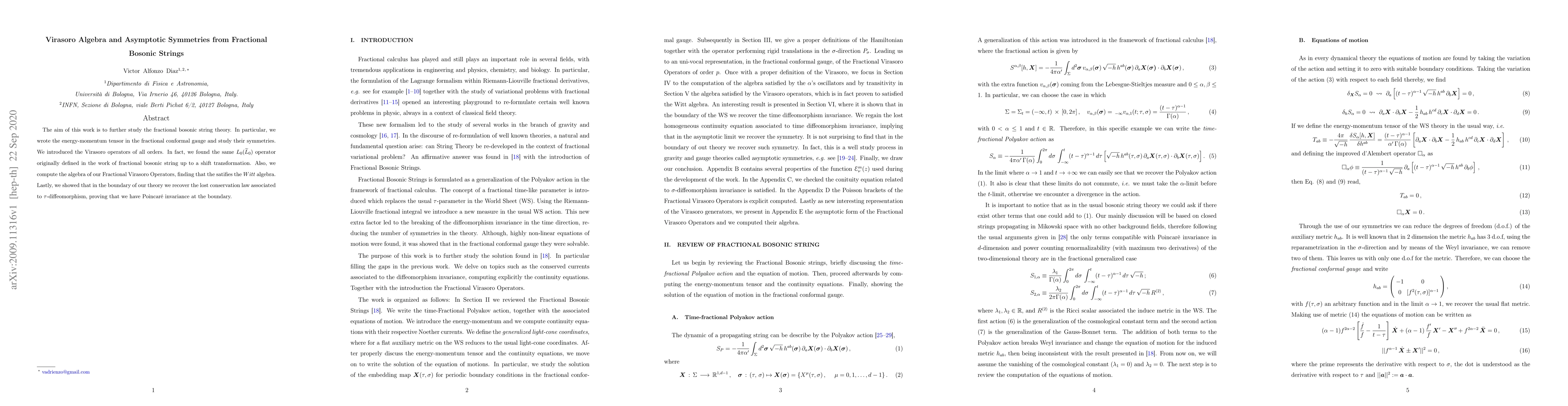 The aim of this work is to further study the fractional bosonic string theory. In particular, we wrote the energy-momentum tensor in the fractional conformal gauge and study their symmetries. We introduced the Virasoro operators of all orders. In fact, we found the same $L_0 (\widetilde{L}_0)$ operator originally defined in the work of fractional bosonic string up to a shift transformation. Also, we compute the algebra of our Fractional Virasoro Operators, finding that the satifies the $Witt$ algebra. Lastly, we showed that in the boundary of our theory we recover the lost conservation law associated to $\tau$-diffeomorphism, proving that we have Poincar\'e invariance at the boundary.