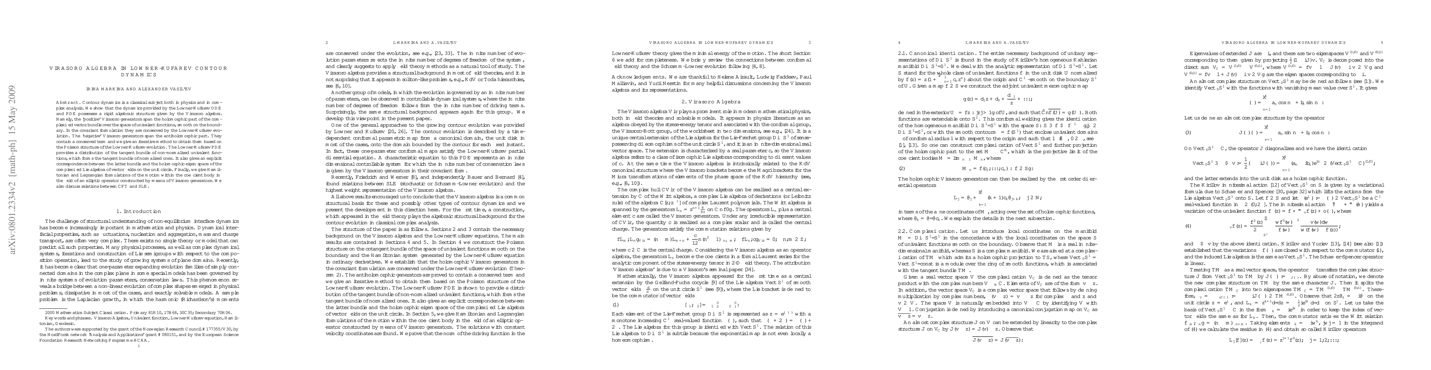 Contour dynamics is a classical subject both in physics and in complex analysis. We show that the dynamics provided by the L\"owner-Kufarev ODE and PDE possesses a rigid algebraic structure given by the Virasoro algebra. Namely, the `positive' Virasoro generators span the holomorphic part of the complexified vector bundle over the space of univalent functions, smooth on the boundary. In the covariant formulation they are conserved by the L\"owner-Kufarev evolution. The `negative' Virasoro generators span the antiholomorphic part. They contain a conserved term and we give an iterative method to obtain them based on the Poisson structure of the L\"owner-Kufarev evolution. The L\"owner-Kufarev PDE provides a distribution of the tangent bundle of non-normalized univalent functions, which forms the tangent bundle of normalized ones. It also gives an explicit correspondence between the latter bundle and the holomorphic eigen space of the complexified Lie algebra of vector fields on the unit circle. Finally, we give Hamiltonian and Lagrangian formulations of the motion within the coefficient body in the field of an elliptic operator constructed by means of Virasoro generators. We also discuss relations between CFT and SLE.