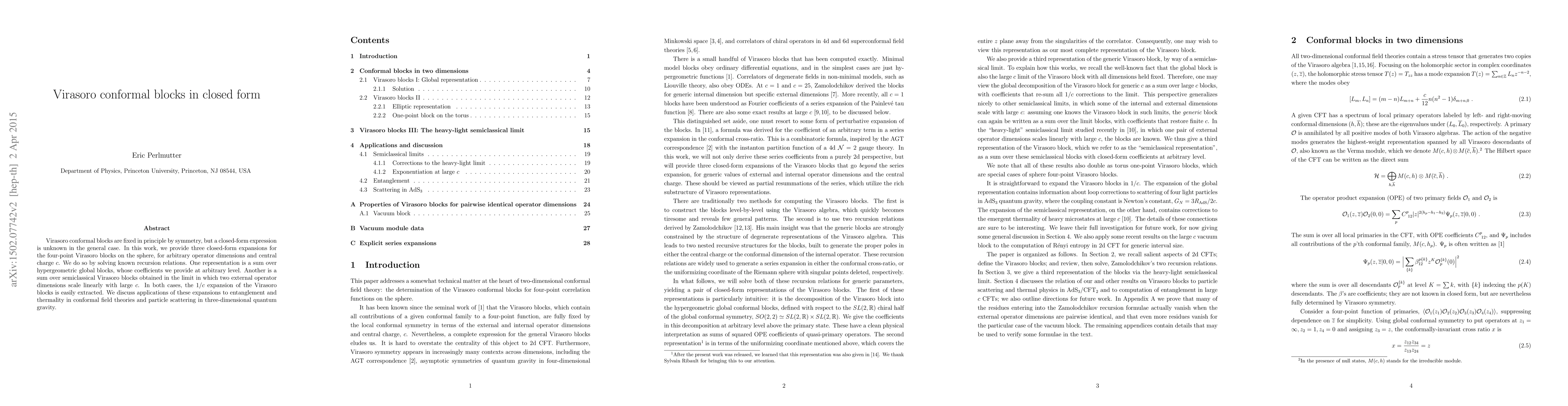 This paper presents closed-form expansions for four-point Virasoro conformal blocks, offering three distinct representations, including hypergeometric and semiclassical limits. These expansions are crucial for understanding entanglement, thermality, and particle scattering in conformal field theories and quantum gravity.