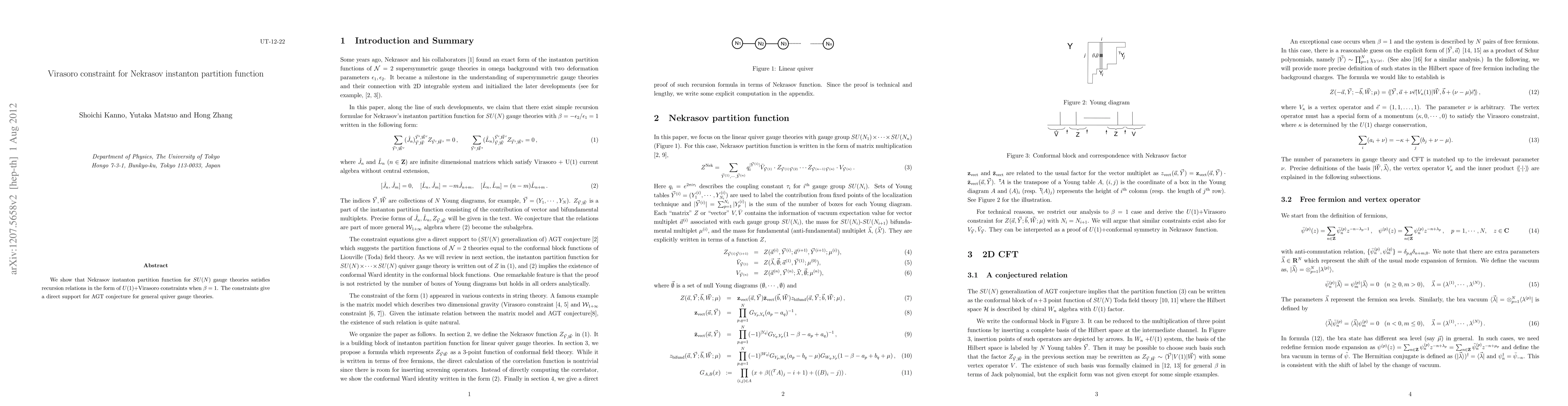 The paper demonstrates that the Nekrasov instanton partition function for SU(N) gauge theories adheres to recursion relations structured by U(1) and Virasoro constraints when β equals 1, thereby supporting the AGT conjecture for general quiver gauge theories.