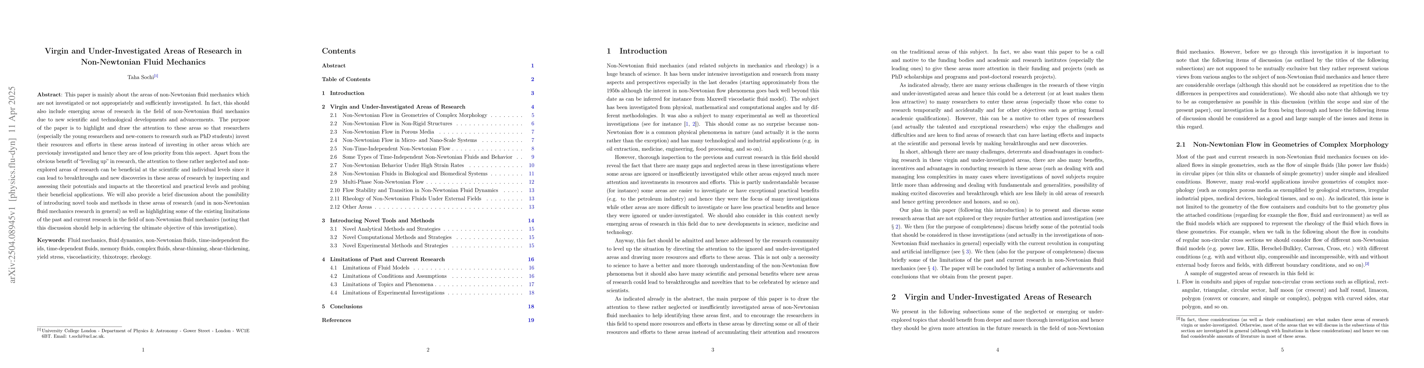 The paper provides a detailed overview of under-explored areas in non-Newtonian fluid mechanics, suggesting novel tools and methods for future research.