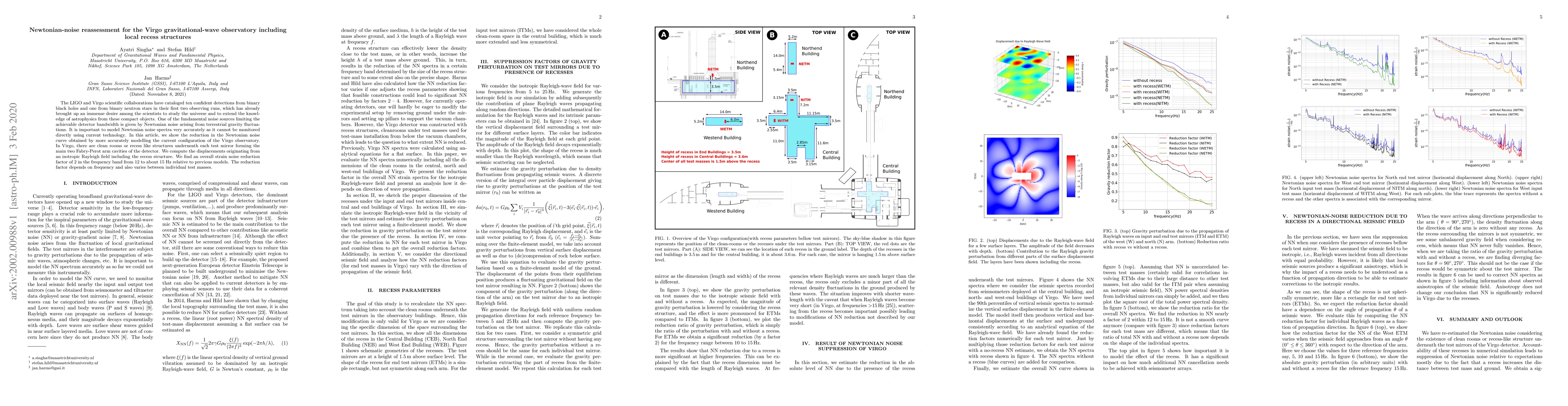 This paper reassesses Newtonian noise in the Virgo observatory, finding a significant reduction in strain noise due to improved modeling of the observatory's configuration, including the recesses beneath the test mirrors. The overall noise reduction factor is approximately 2 in the frequency band from 12 to 15 Hz.