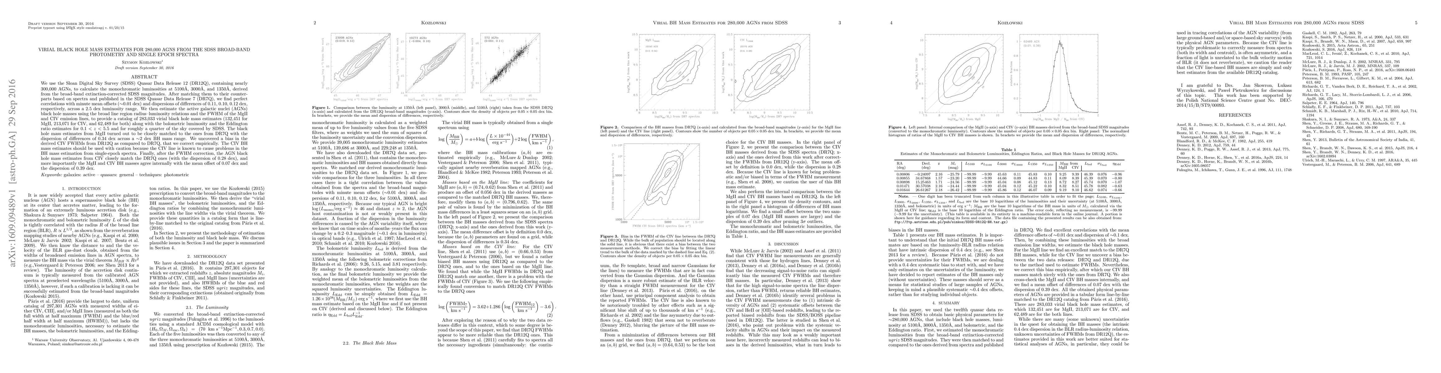 This paper estimates the black hole masses of 280,000 active galactic nuclei (AGNs) from the Sloan Digital Sky Survey (SDSS) using broad-band photometry and single-epoch spectra. The study provides a catalog of virial black hole mass estimates, highlighting close agreement between MgII and CIV estimates after correcting for biases.