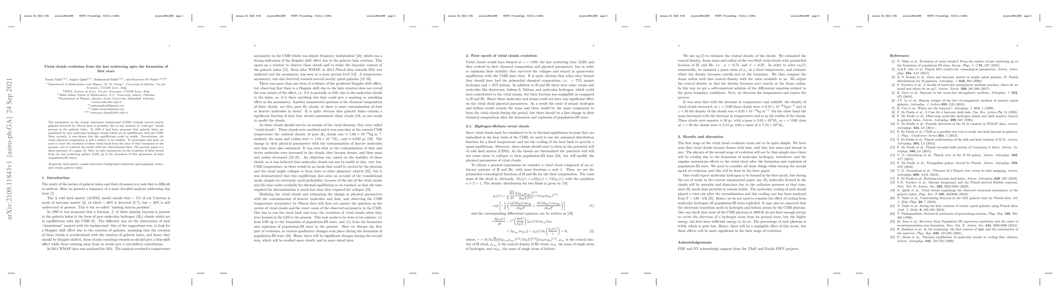 The asymmetry in the cosmic microwave background (CMB) towards several nearby galaxies detected by Planck data is probably due to the rotation of "cold gas" clouds present in the galactic halos. In 1995 it had been proposed that galactic halos are populated by pure molecular hydrogen clouds which are in equillibrium with the CMB. More recently, it was shown that the equillibrium could be stable. Nevertheless, the cloud chemical composition is still a matter to be studied. To investigate this issue we need to trace the evolution of these virial cloud from the time of their formation to the present, and to confront the model with the observational data. The present paper is a short summary of a paper [1]. Here we only concentrate on the evolution of these clouds from the last scattering surface (LSS) up to the formation of first generation of stars (population-III stars).