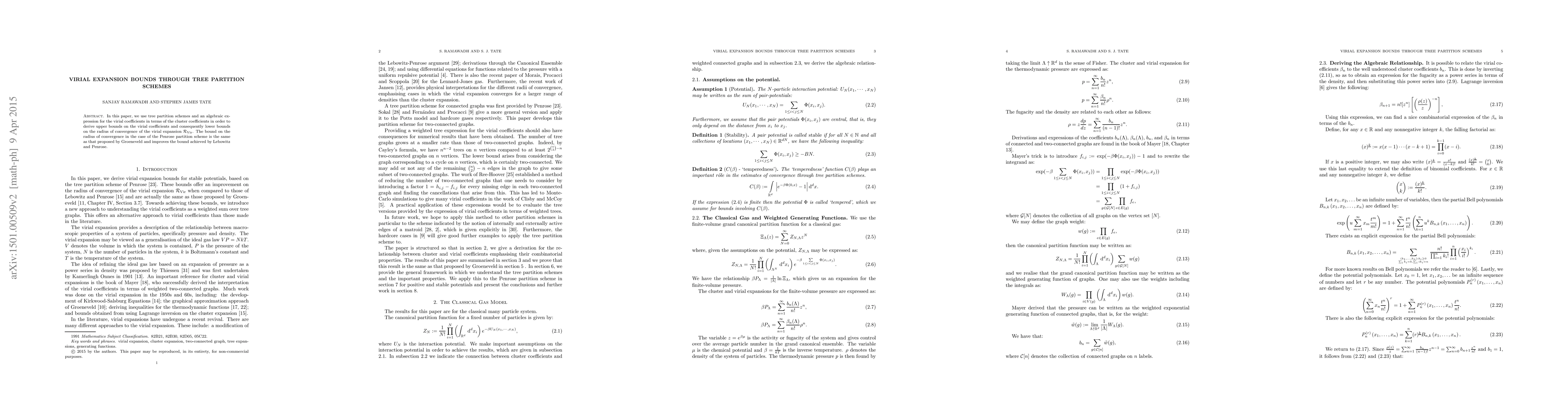 This paper utilizes tree partition schemes and an algebraic expression for virial coefficients to derive upper bounds on these coefficients and lower bounds on the radius of convergence of the virial expansion $\mathcal{R}_{\textrm{Vir}}$. The Penrose partition scheme achieves a tighter convergence radius bound compared to previous Lebowitz and Penrose results.